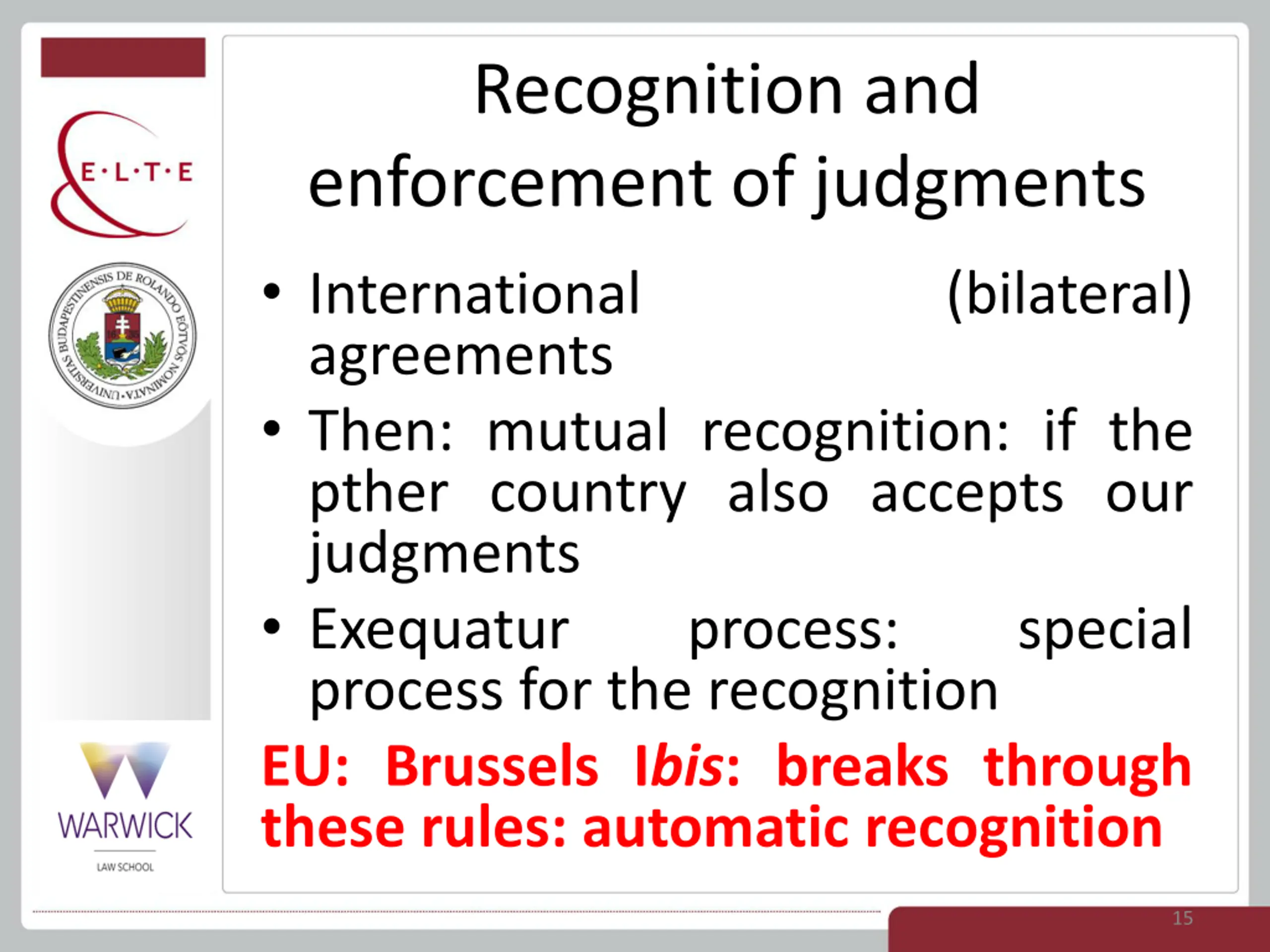 Recognition and enforcement of judgments International agreements Then: mutual recognition: if the pther country also accepts our judgments Exequatur process: process for the recognition EU: Brussels Ibis: breaks through these rules: automatic recognition (bilateral) special 15