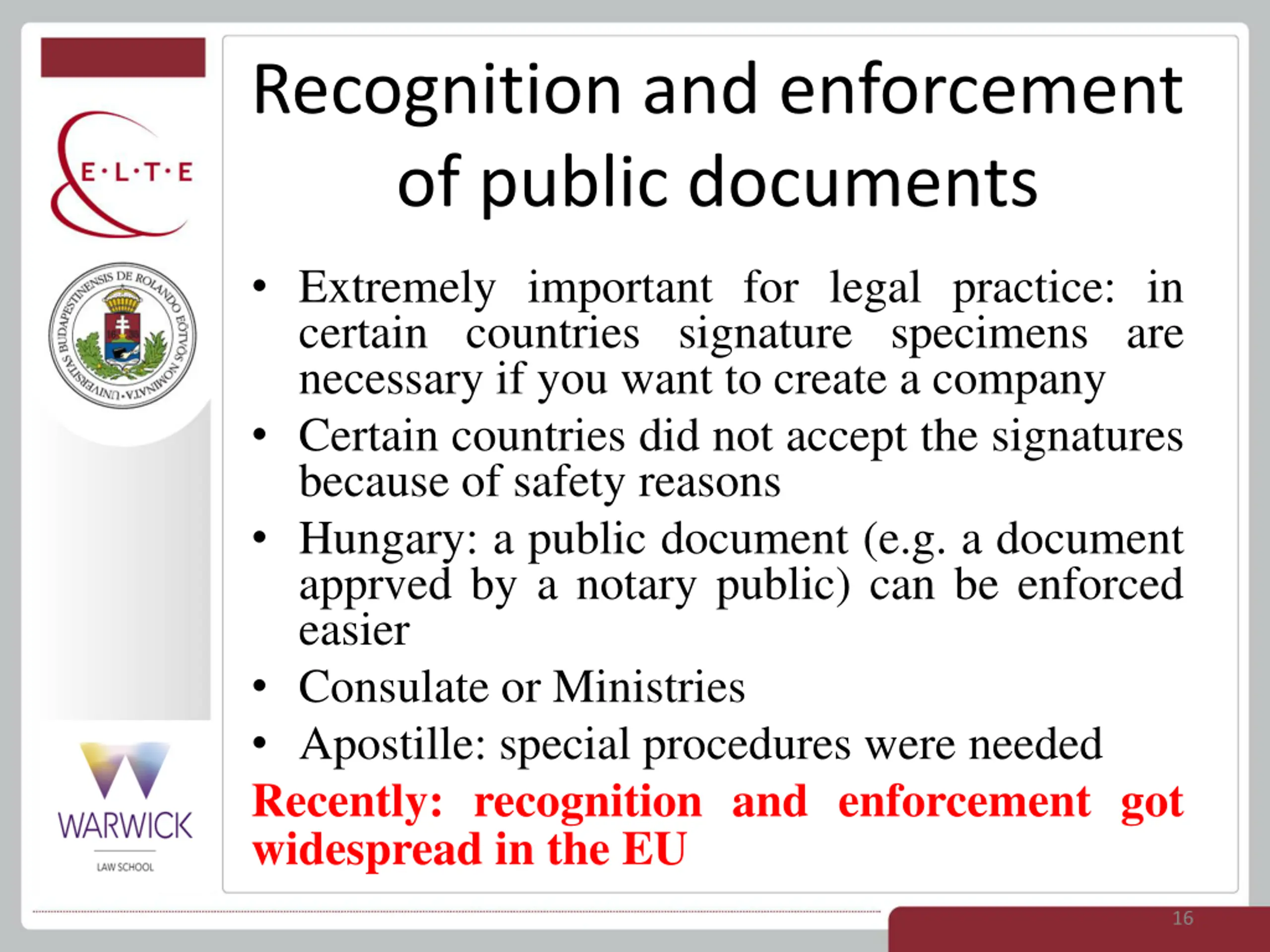 Recognition and enforcement of public documents Extremely important for legal practice: in certain countries signature specimens are necessary if you want to create a company Certain countries did not accept the signatures because of safety reasons Hungary: a public document (e.g. a document apprved by a notary public) can be enforced easier Consulate or Ministries Apostille: special procedures were needed Recently: recognition and enforcement got widespread in the EU 16