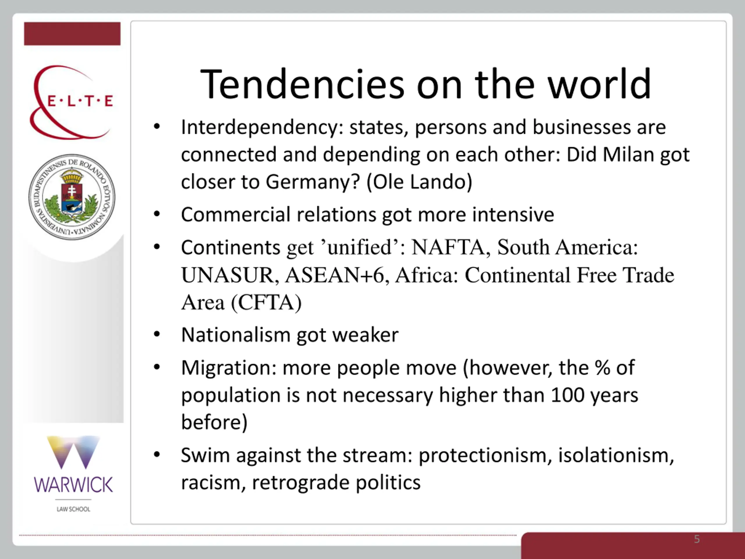 Tendencies on the world Interdependency: states, persons and businesses are connected and depending on each other: Did Milan got closer to Germany? (Ole Lando) Commercial relations got more intensive Continents get unified : NAFTA, South America: UNASUR, ASEAN+6, Africa: Continental Free Trade Area (CFTA) Nationalism got weaker Migration: more people move (however, the % of population is not necessary higher than 100 years before) Swim against the stream: protectionism, isolationism, racism, retrograde politics 5