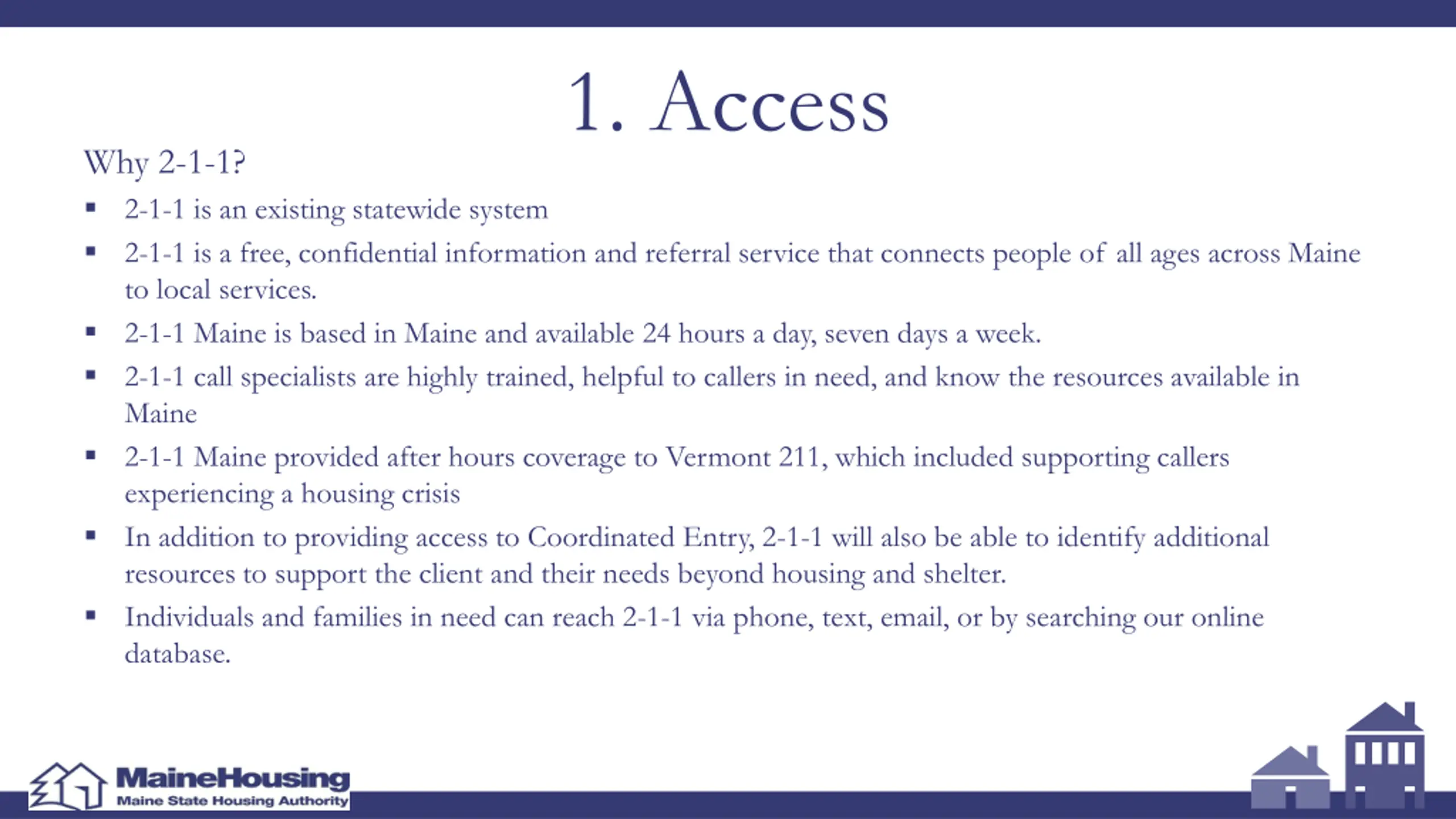 1. Access Why 2-1-1? 2-1-1 is an existing statewide system 2-1-1 is a free, confidential information and referral service that connects people of all ages across Maine to local services. 2-1-1 Maine is based in Maine and available 24 hours a day, seven days a week. 2-1-1 call specialists are highly trained, helpful to callers in need, and know the resources available in Maine 2-1-1 Maine provided after hours coverage to Vermont 211, which included supporting callers experiencing a housing crisis In addition to providing access to Coordinated Entry, 2-1-1 will also be able to identify additional resources to support the client and their needs beyond housing and shelter. Individuals and families in need can reach 2-1-1 via phone, text, email, or by searching our online database.