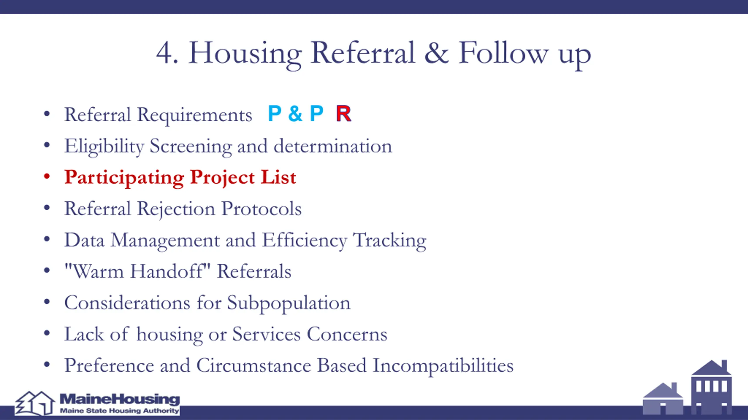 4. Housing Referral & Follow up Referral Requirements P & P R Eligibility Screening and determination Participating Project List Referral Rejection Protocols Data Management and Efficiency Tracking "Warm Handoff" Referrals Considerations for Subpopulation Lack of housing or Services Concerns Preference and Circumstance Based Incompatibilities
