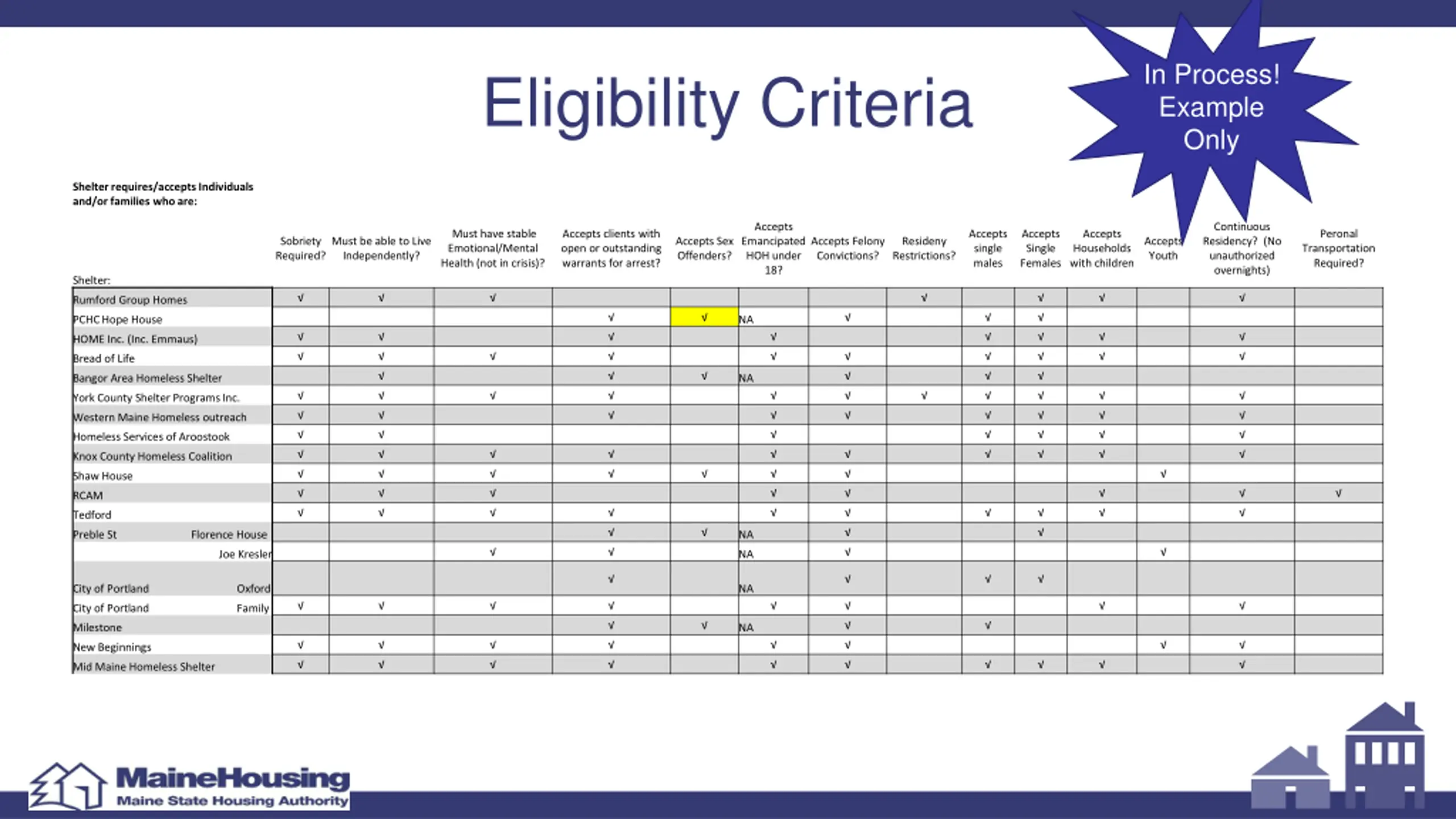 In Process! Example Only Eligibility Criteria Shelter requires/accepts Individuals and/or families who are: Accepts Emancipated HOH under 18? Continuous Residency? (No unauthorized overnights) Must have stable Emotional/Mental Health (not in crisis)? Accepts clients with open or outstanding warrants for arrest? Accepts single males Accepts Single Females Accepts Households with children Peronal Transportation Required? Sobriety Required? Must be able to Live Independently? Accepts Sex Offenders? Accepts Felony Convictions? Resideny Restrictions? Accepts Youth Shelter: Rumford Group Homes PCHC Hope House NA HOME Inc. (Inc. Emmaus) Bread of Life Bangor Area Homeless Shelter NA York County Shelter Programs Inc. Western Maine Homeless outreach Homeless Services of Aroostook Knox County Homeless Coalition Shaw House RCAM Tedford Preble St Florence House NA Joe Kresler NA City of Portland Oxford NA City of Portland Family Milestone NA New Beginnings Mid Maine Homeless Shelter