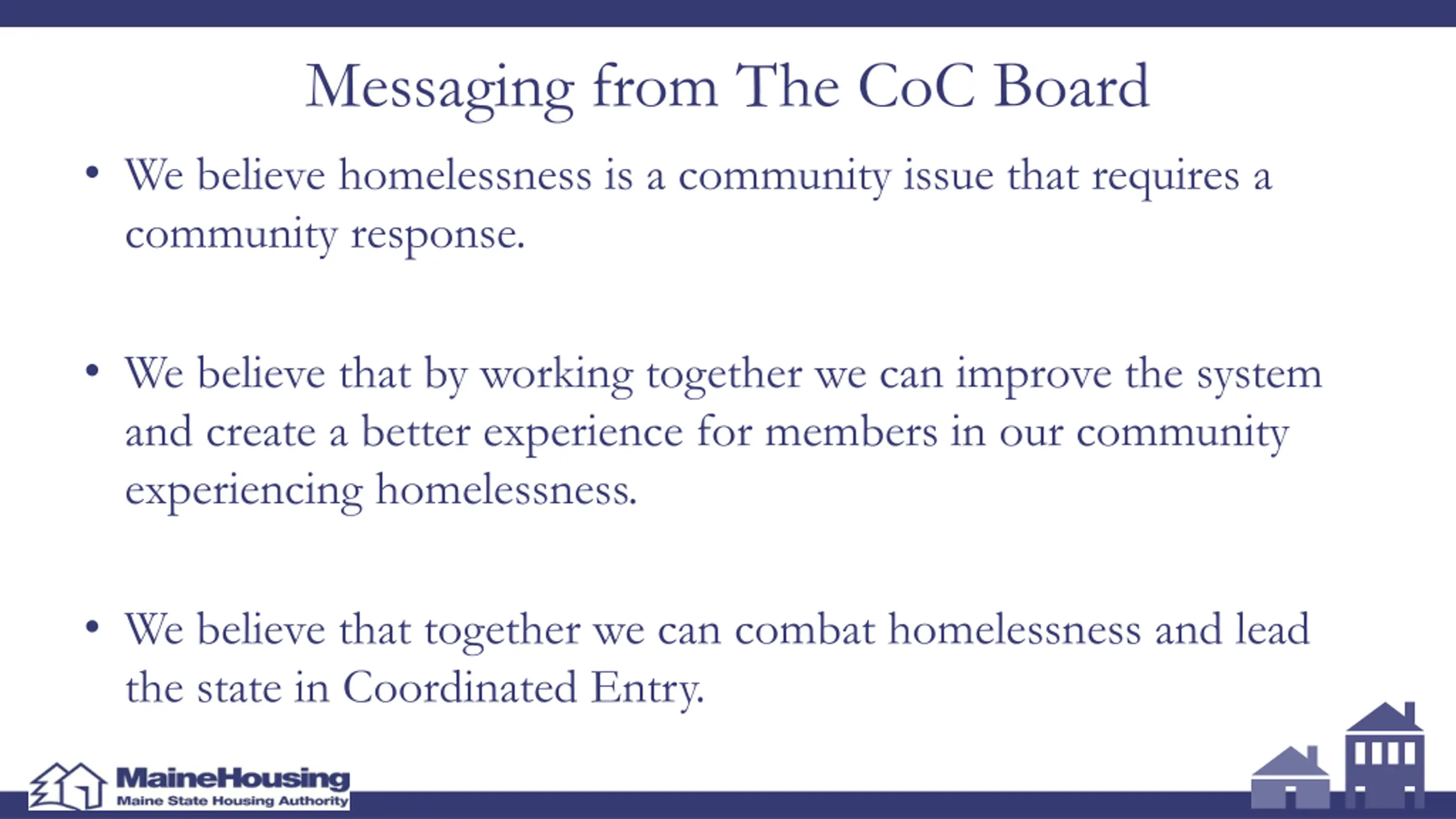 Messaging from The CoC Board We believe homelessness is a community issue that requires a community response. We believe that by working together we can improve the system and create a better experience for members in our community experiencing homelessness. We believe that together we can combat homelessness and lead the state in Coordinated Entry.