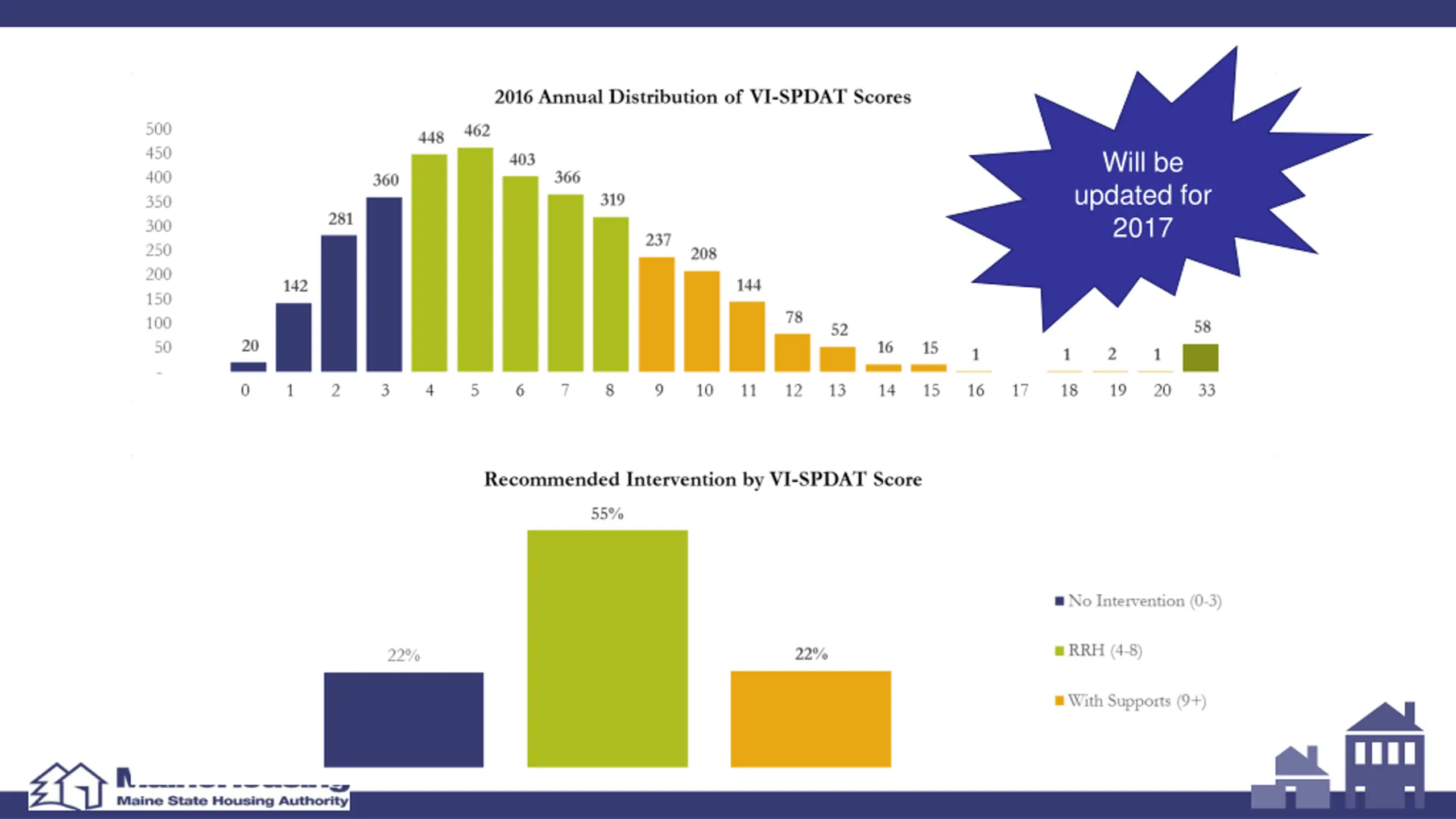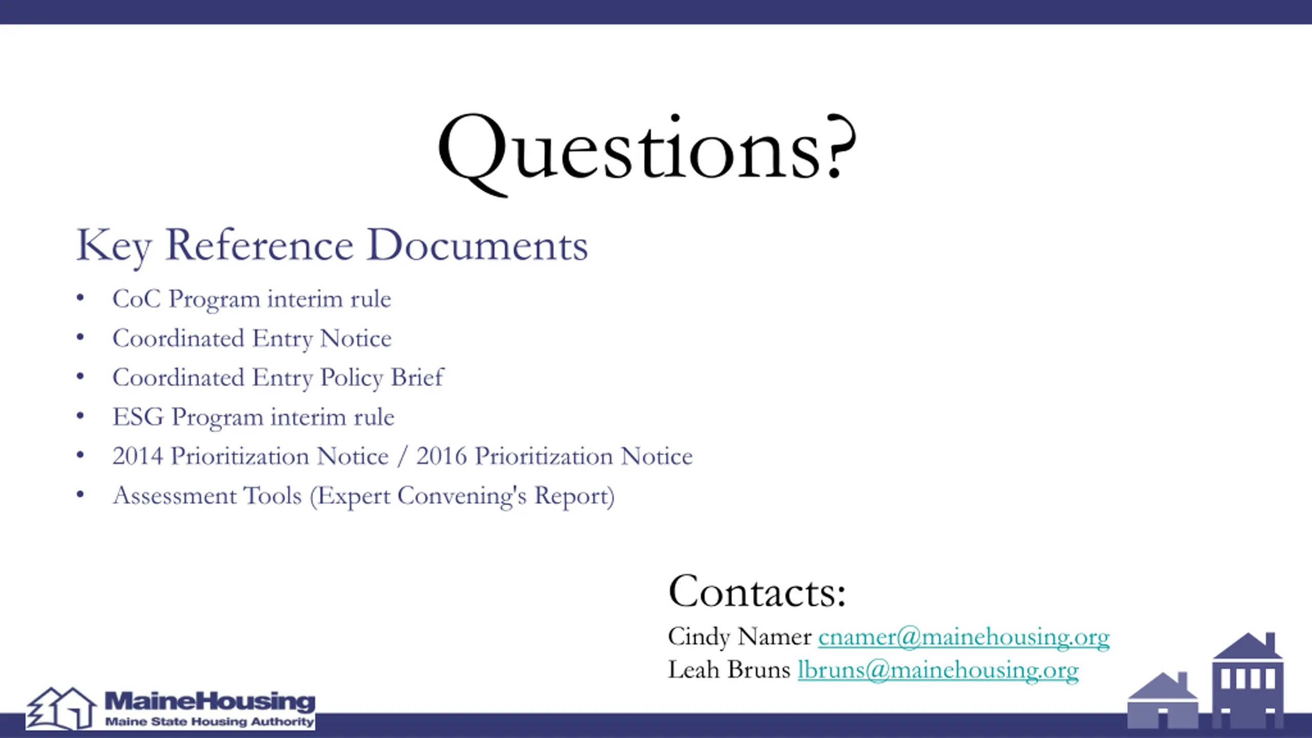 Questions? Key Reference Documents CoC Program interim rule Coordinated Entry Notice Coordinated Entry Policy Brief ESG Program interim rule 2014 Prioritization Notice / 2016 Prioritization Notice Assessment Tools (Expert Convening's Report) Contacts: Cindy Namer cnamer@mainehousing.org Leah Bruns lbruns@mainehousing.org