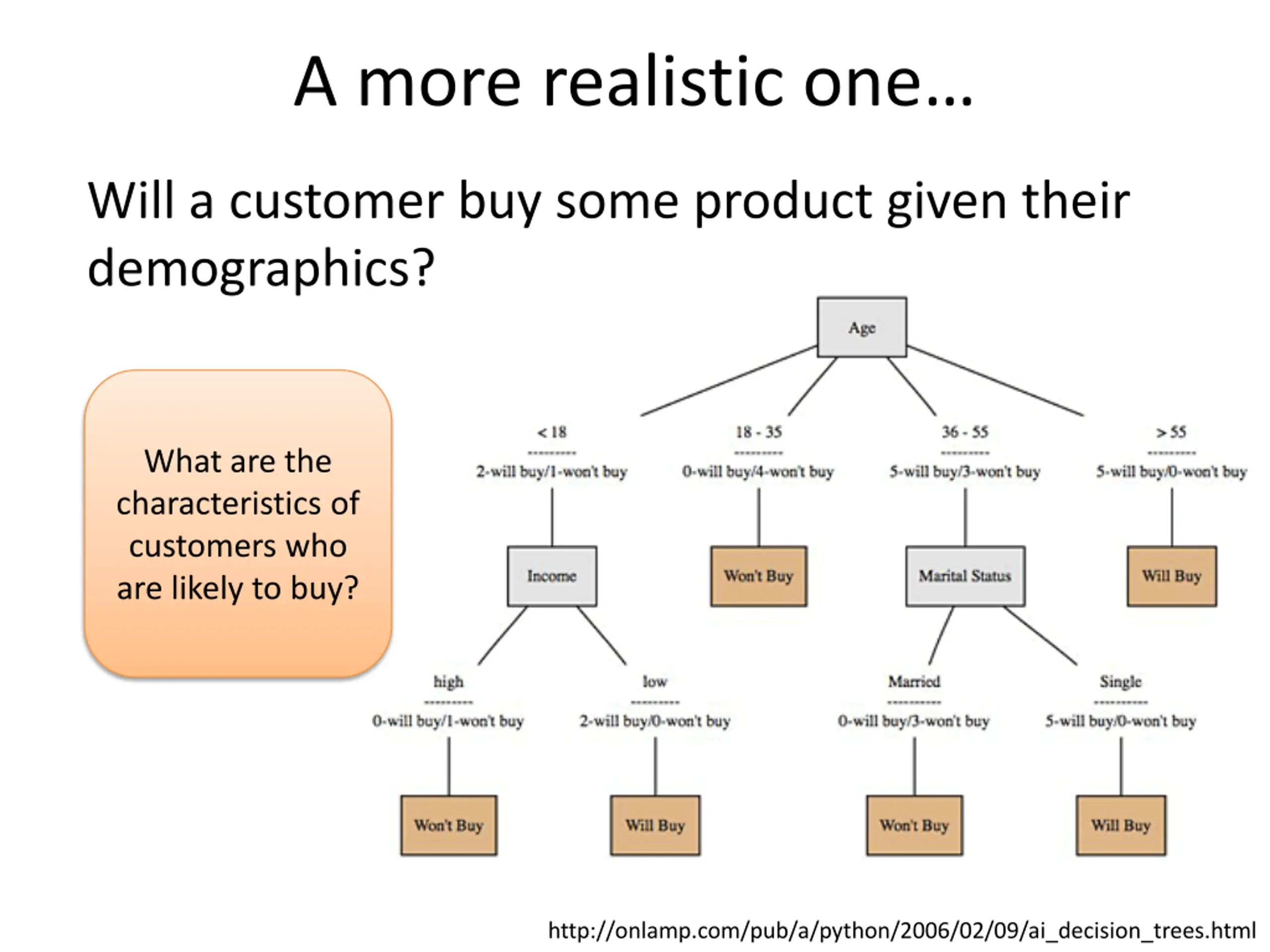 A more realistic one Will a customer buy some product given their demographics? What are the characteristics of customers who are likely to buy? http://onlamp.com/pub/a/python/2006/02/09/ai_decision_trees.html