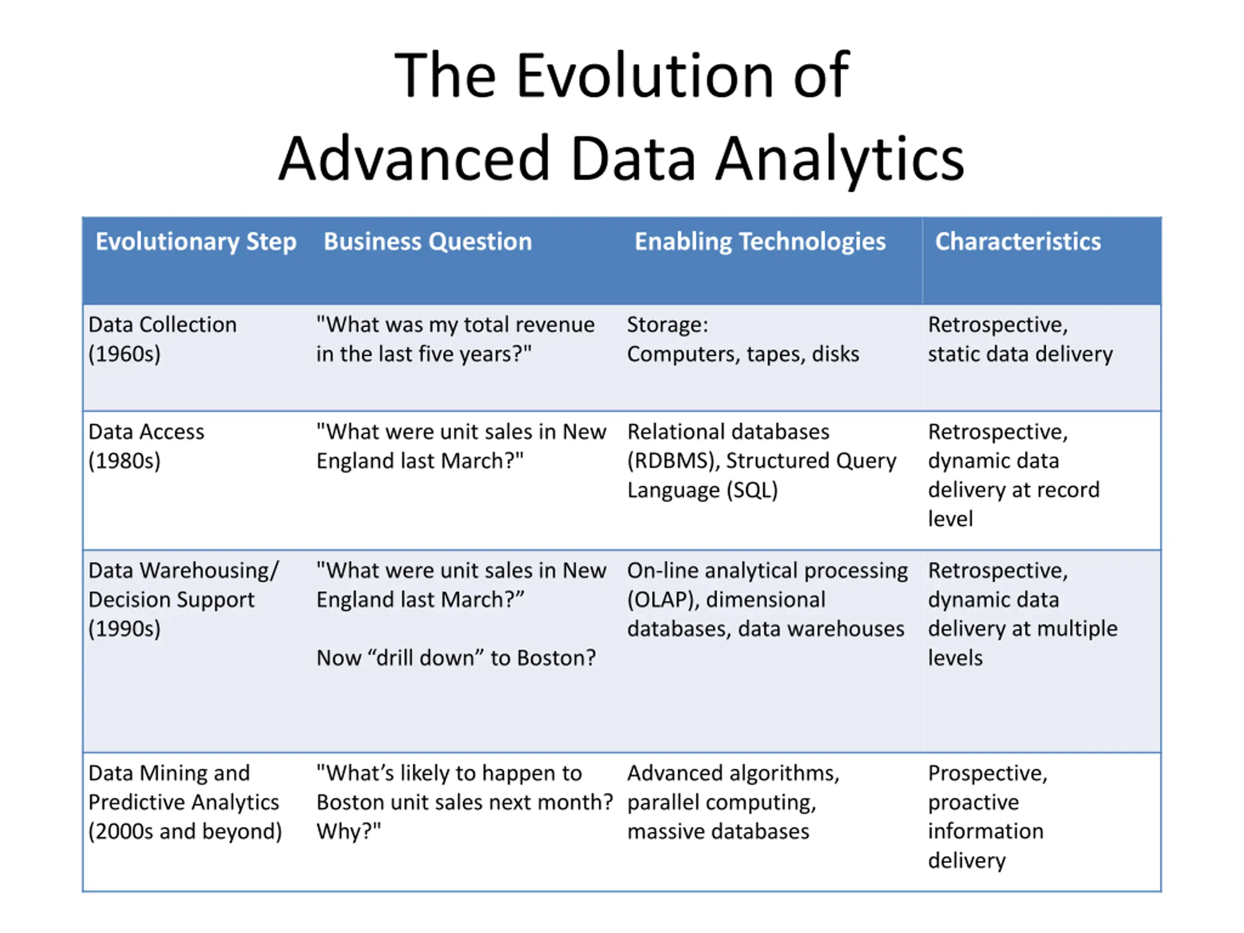 The Evolution of Advanced Data Analytics Evolutionary Step Business Question Enabling Technologies Characteristics Data Collection (1960s) "What was my total revenue in the last five years?" Storage: Computers, tapes, disks Retrospective, static data delivery Data Access (1980s) "What were unit sales in New England last March?" Relational databases (RDBMS), Structured Query Language (SQL) Retrospective, dynamic data delivery at record level Data Warehousing/ Decision Support (1990s) "What were unit sales in New England last March? On-line analytical processing (OLAP), dimensional databases, data warehouses Retrospective, dynamic data delivery at multiple levels Now drill down to Boston? Data Mining and Predictive Analytics (2000s and beyond) "What s likely to happen to Boston unit sales next month? Why?" Advanced algorithms, parallel computing, massive databases Prospective, proactive information delivery