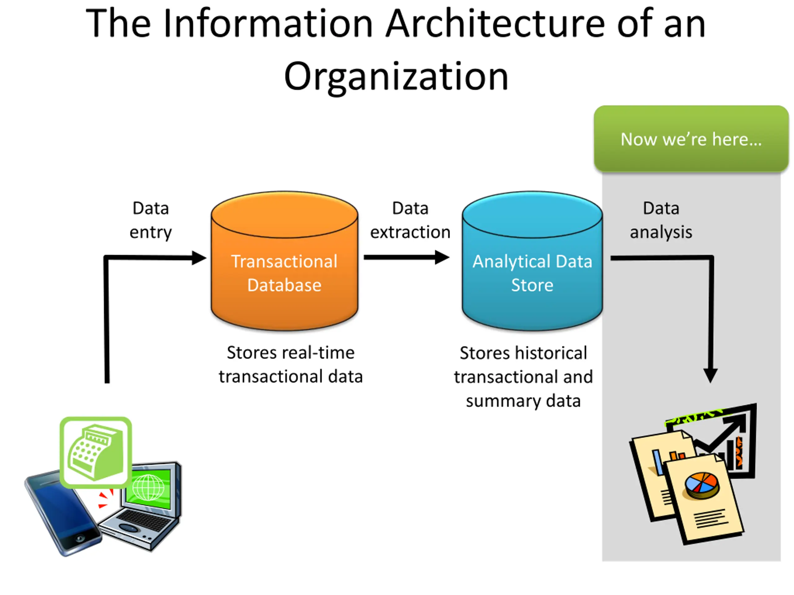 The Information Architecture of an Organization Now we re here Data entry Data Data analysis extraction Transactional Database Analytical Data Store Stores real-time transactional data Stores historical transactional and summary data