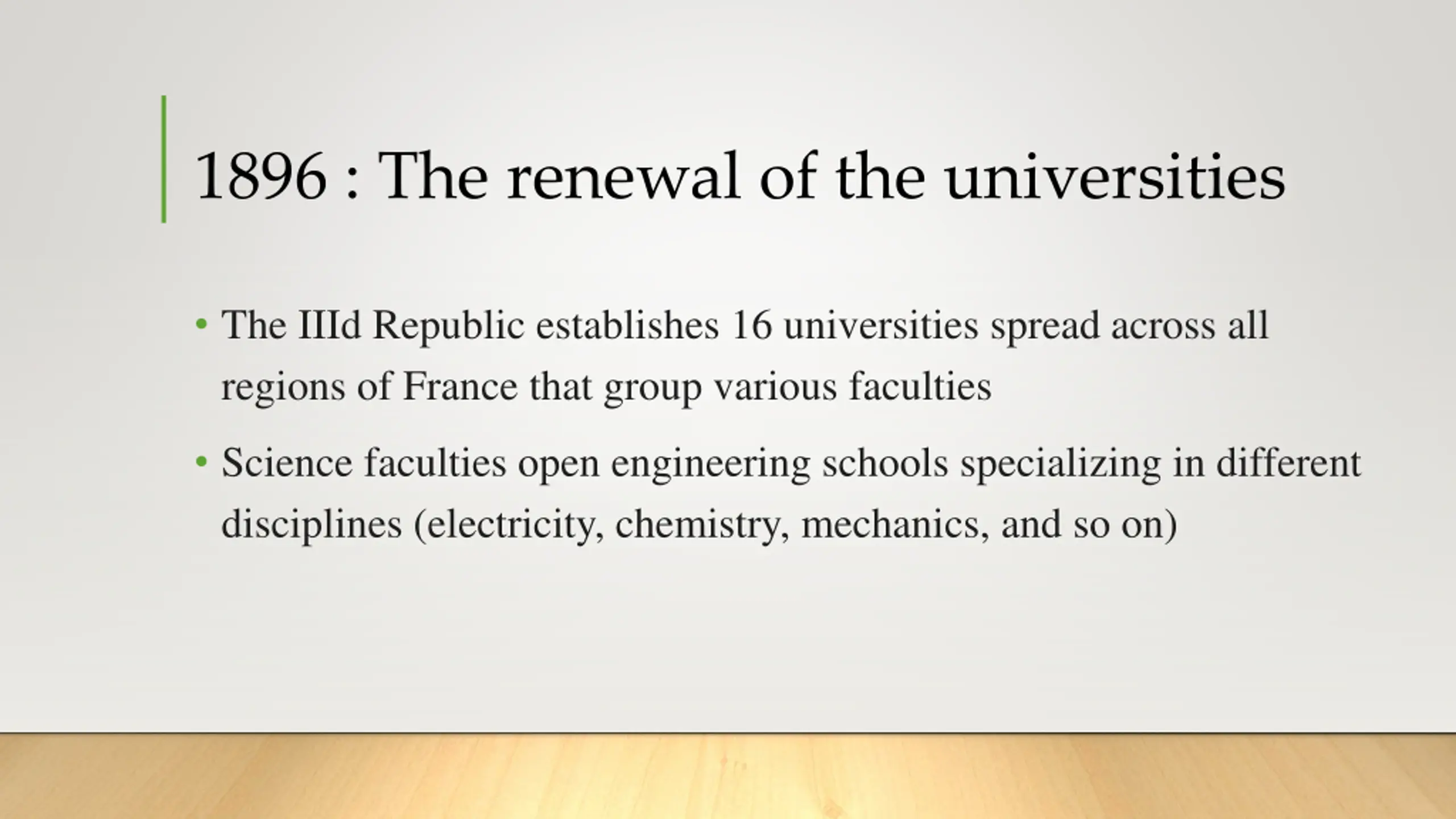 1896 : The renewal of the universities The IIId Republic establishes 16 universities spread across all regions of France that group various faculties Science faculties open engineering schools specializing in different disciplines (electricity, chemistry, mechanics, and so on)