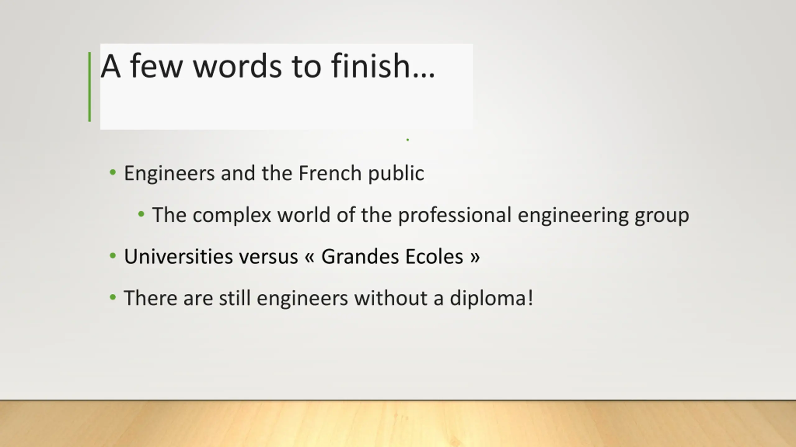 A few words to finish Engineers and the French public The complex world of the professional engineering group Universities versus Grandes Ecoles There are still engineers without a diploma!