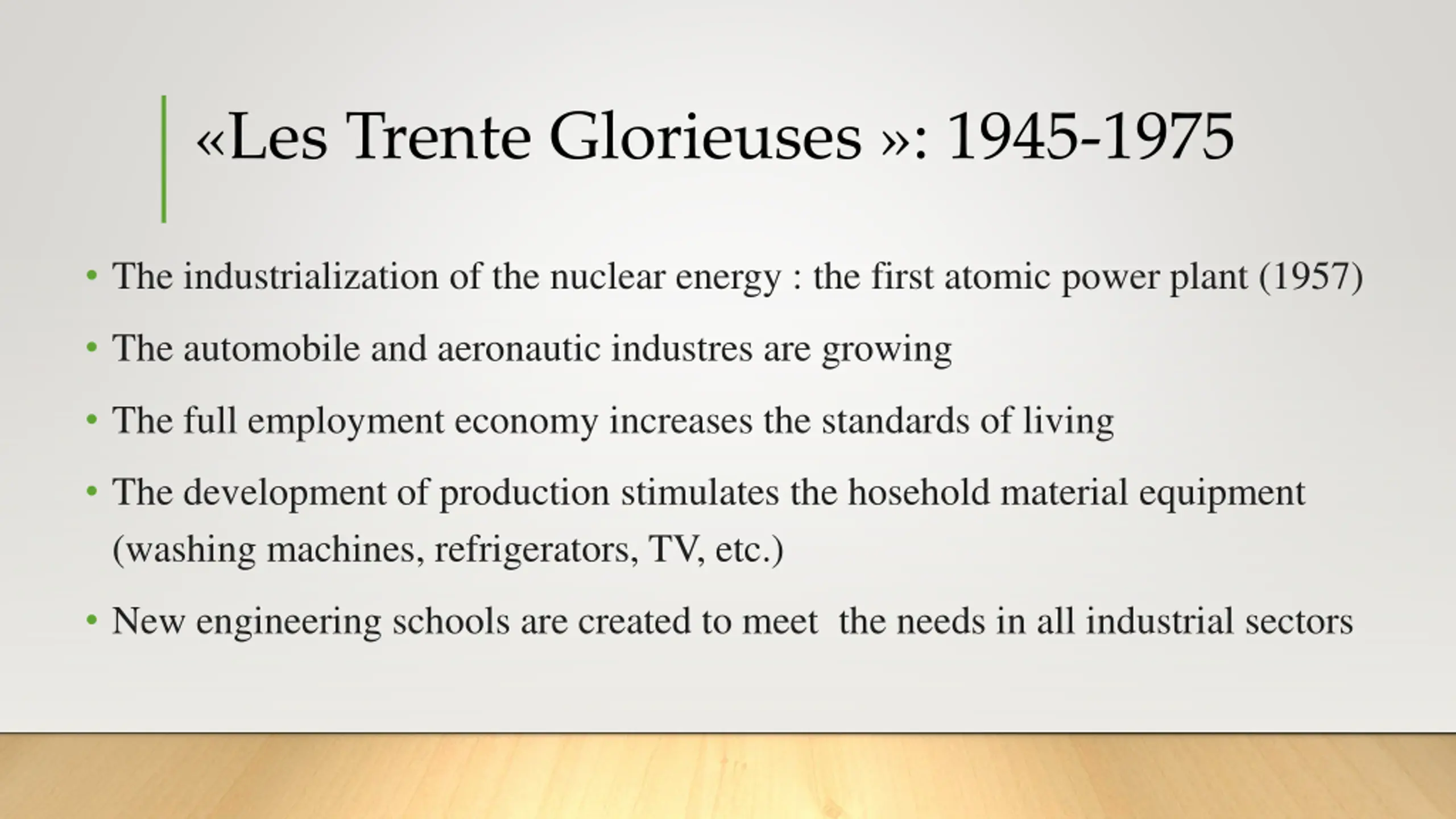 Les Trente Glorieuses : 1945-1975 The industrialization of the nuclear energy : the first atomic power plant (1957) The automobile and aeronautic industres are growing The full employment economy increases the standards of living The development of production stimulates the hosehold material equipment (washing machines, refrigerators, TV, etc.) New engineering schools are created to meet the needs in all industrial sectors