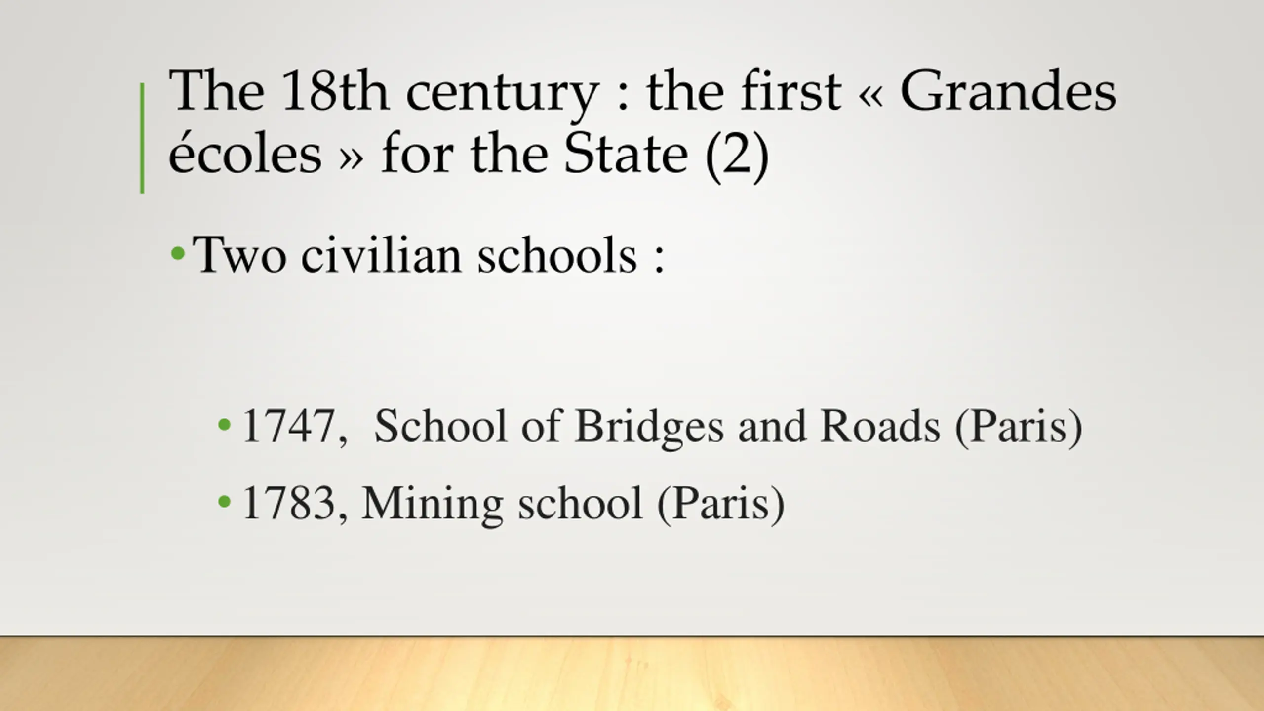 The 18th century : the first Grandes coles for the State (2) Two civilian schools : 1747, School of Bridges and Roads (Paris) 1783, Mining school (Paris)