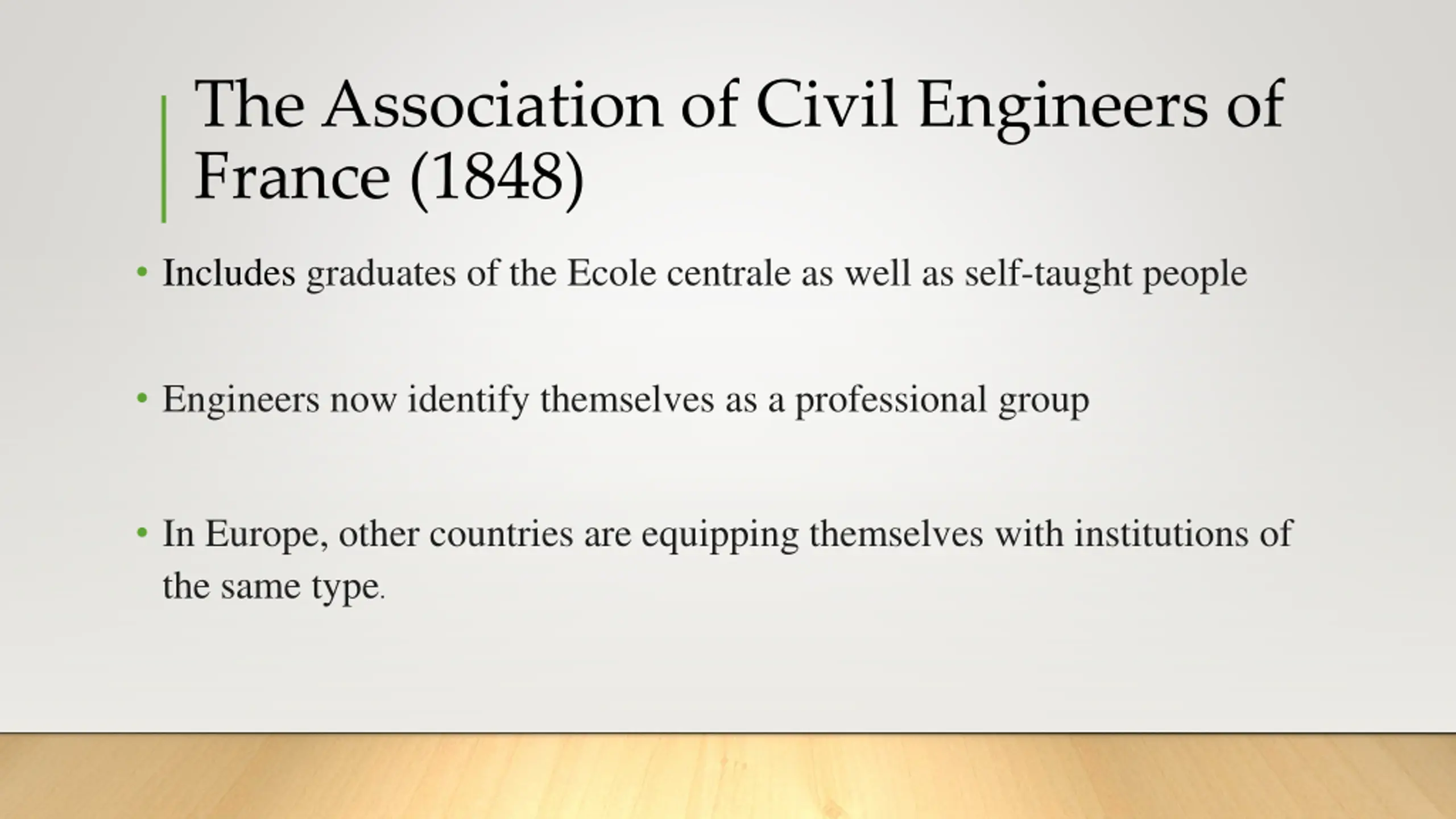 The Association of Civil Engineers of France (1848) Includes graduates of the Ecole centrale as well as self-taught people Engineers now identify themselves as a professional group In Europe, other countries are equipping themselves with institutions of the same type.