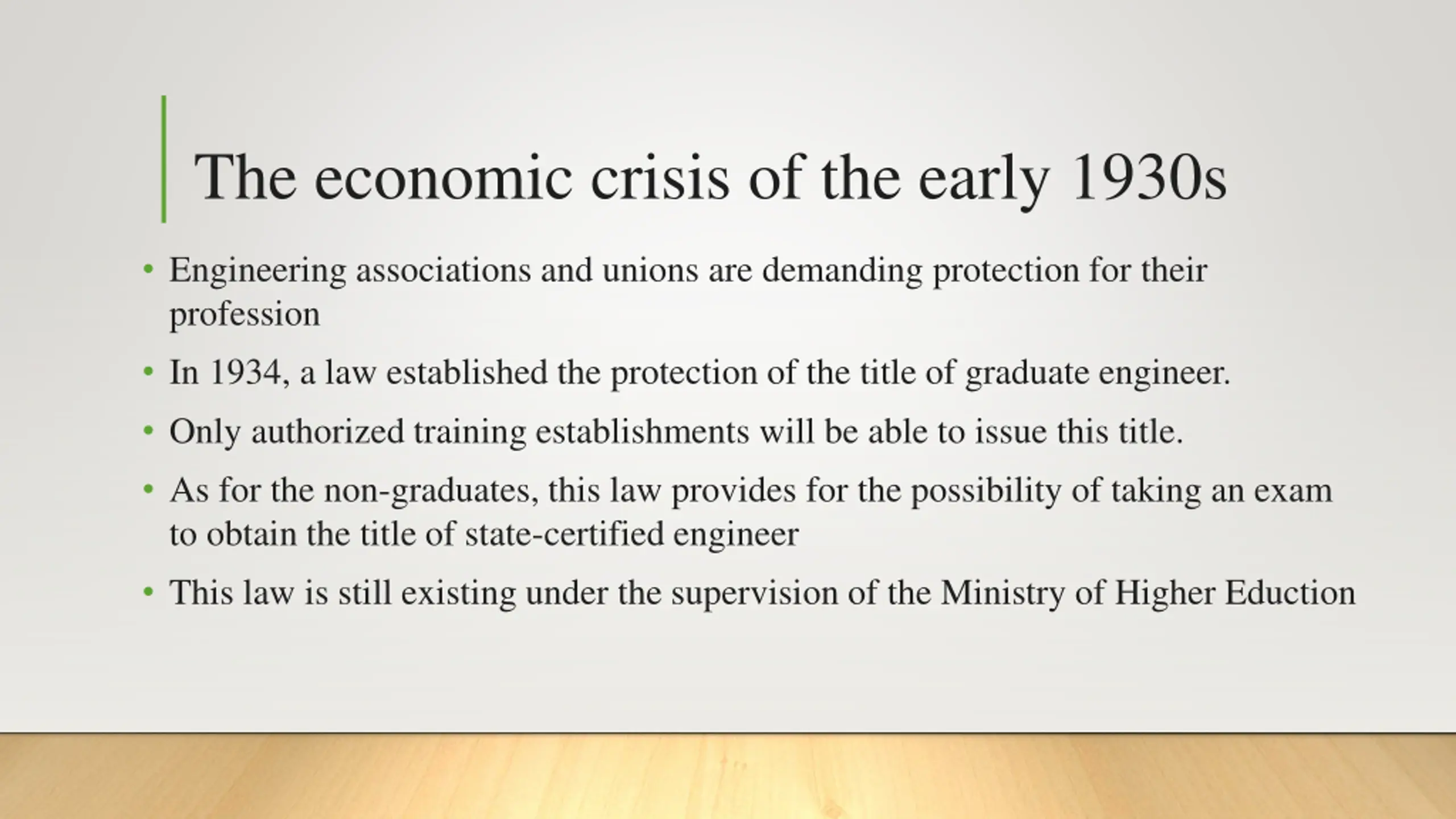 The economic crisis of the early 1930s Engineering associations and unions are demanding protection for their profession In 1934, a law established the protection of the title of graduate engineer. Only authorized training establishments will be able to issue this title. As for the non-graduates, this law provides for the possibility of taking an exam to obtain the title of state-certified engineer This law is still existing under the supervision of the Ministry of Higher Eduction