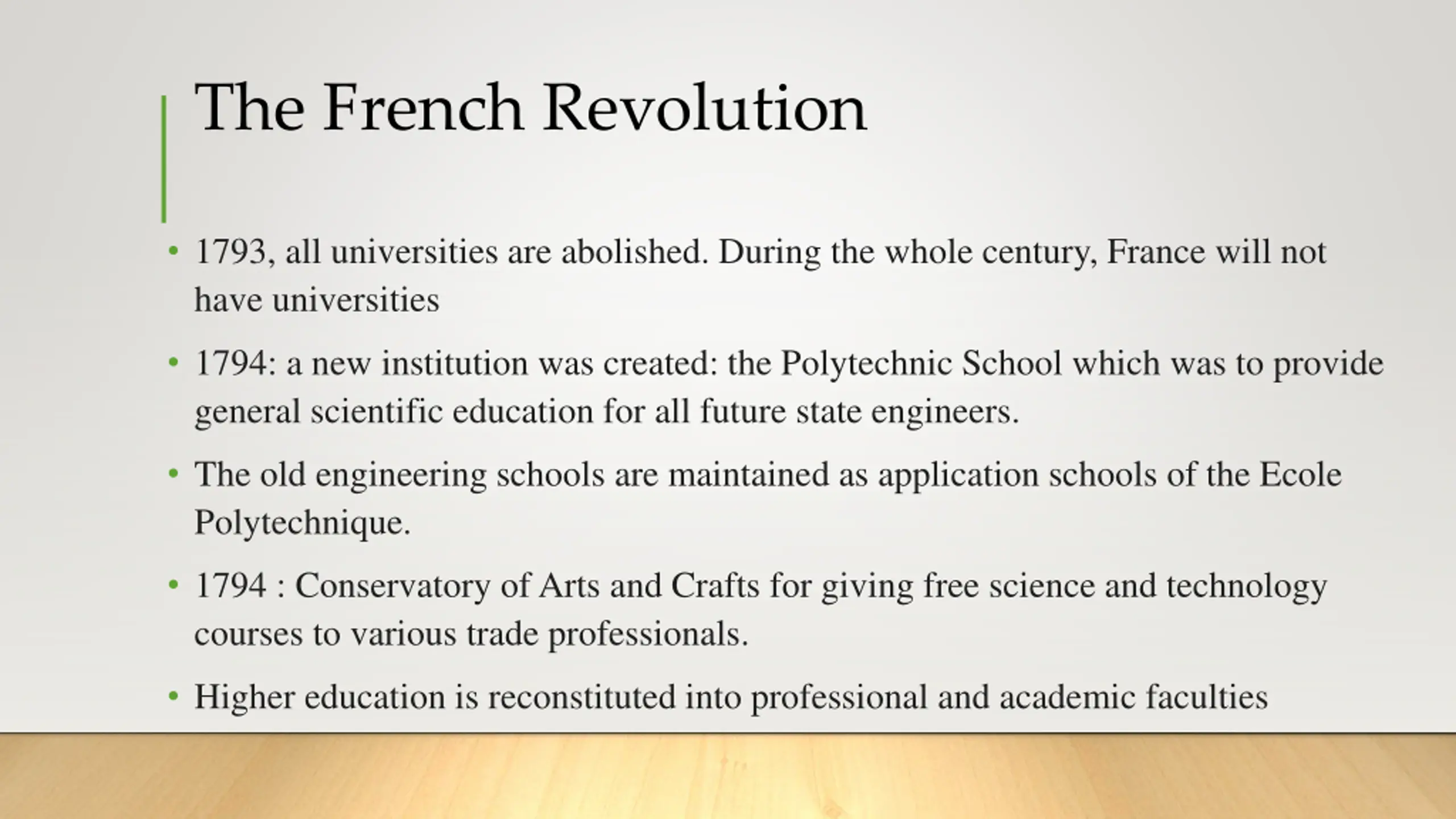 The French Revolution 1793, all universities are abolished. During the whole century, France will not have universities 1794: a new institution was created: the Polytechnic School which was to provide general scientific education for all future state engineers. The old engineering schools are maintained as application schools of the Ecole Polytechnique. 1794 : Conservatory of Arts and Crafts for giving free science and technology courses to various trade professionals. Higher education is reconstituted into professional and academic faculties