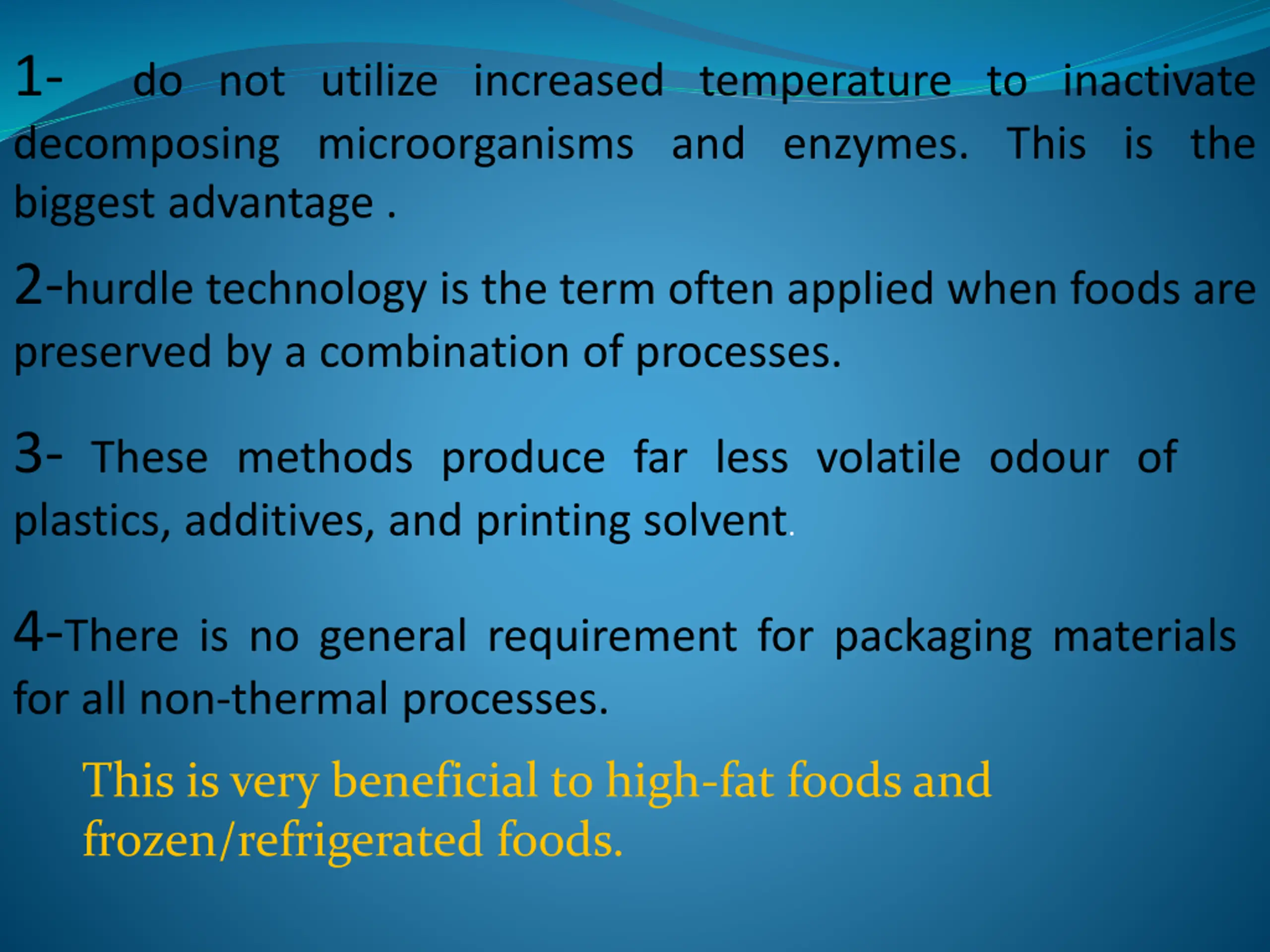 1- do not utilize increased temperature to inactivate decomposing microorganisms and enzymes. This is the biggest advantage . 2-hurdle technology is the term often applied when foods are preserved by a combination of processes. 3- These methods produce far less volatile odour of plastics, additives, and printing solvent. 4-There is no general requirement for packaging materials for all non-thermal processes. This is very beneficial to high-fat foods and frozen/refrigerated foods.