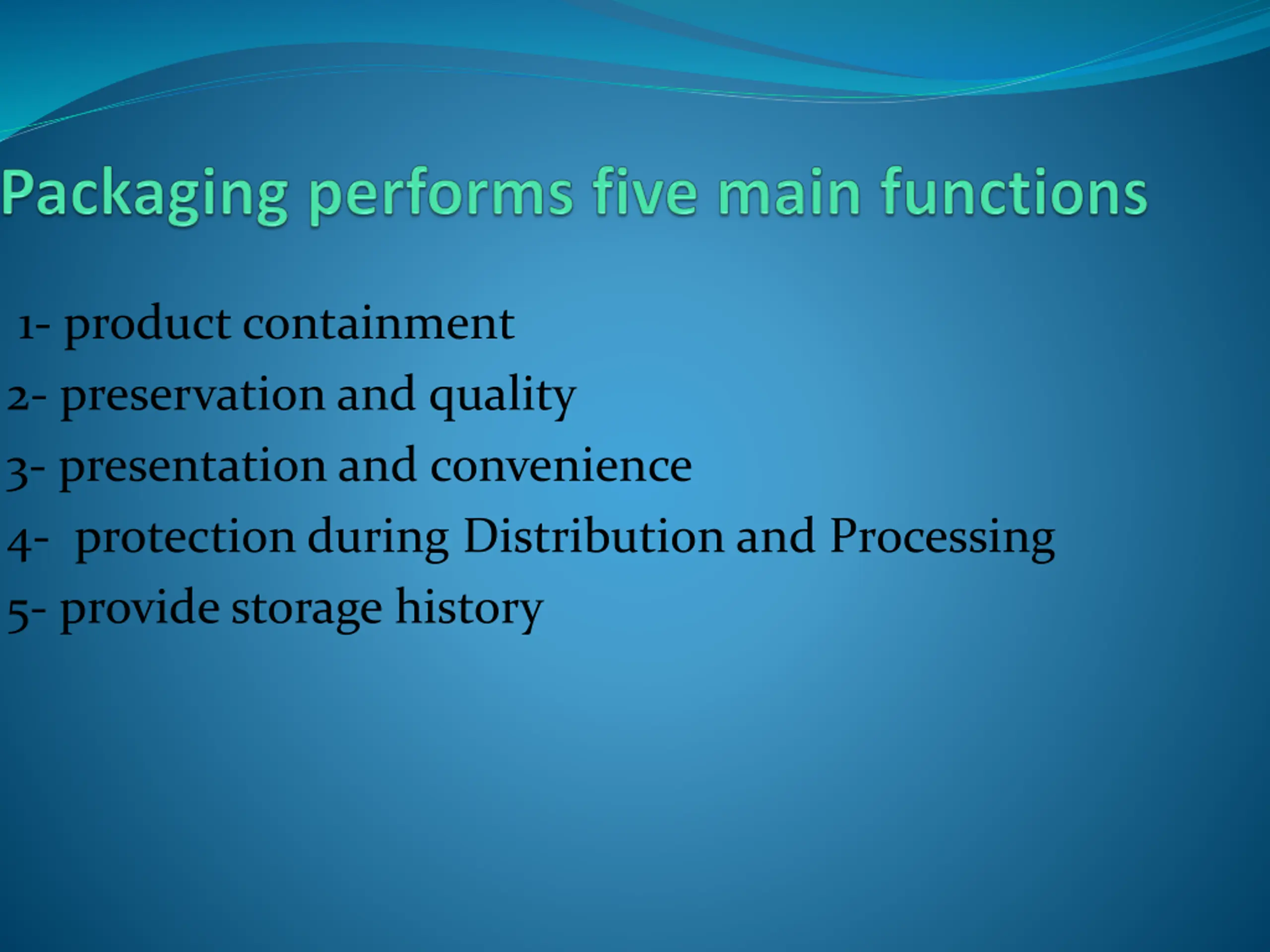 1- product containment 2- preservation and quality 3- presentation and convenience 4- protection during Distribution and Processing 5- provide storage history