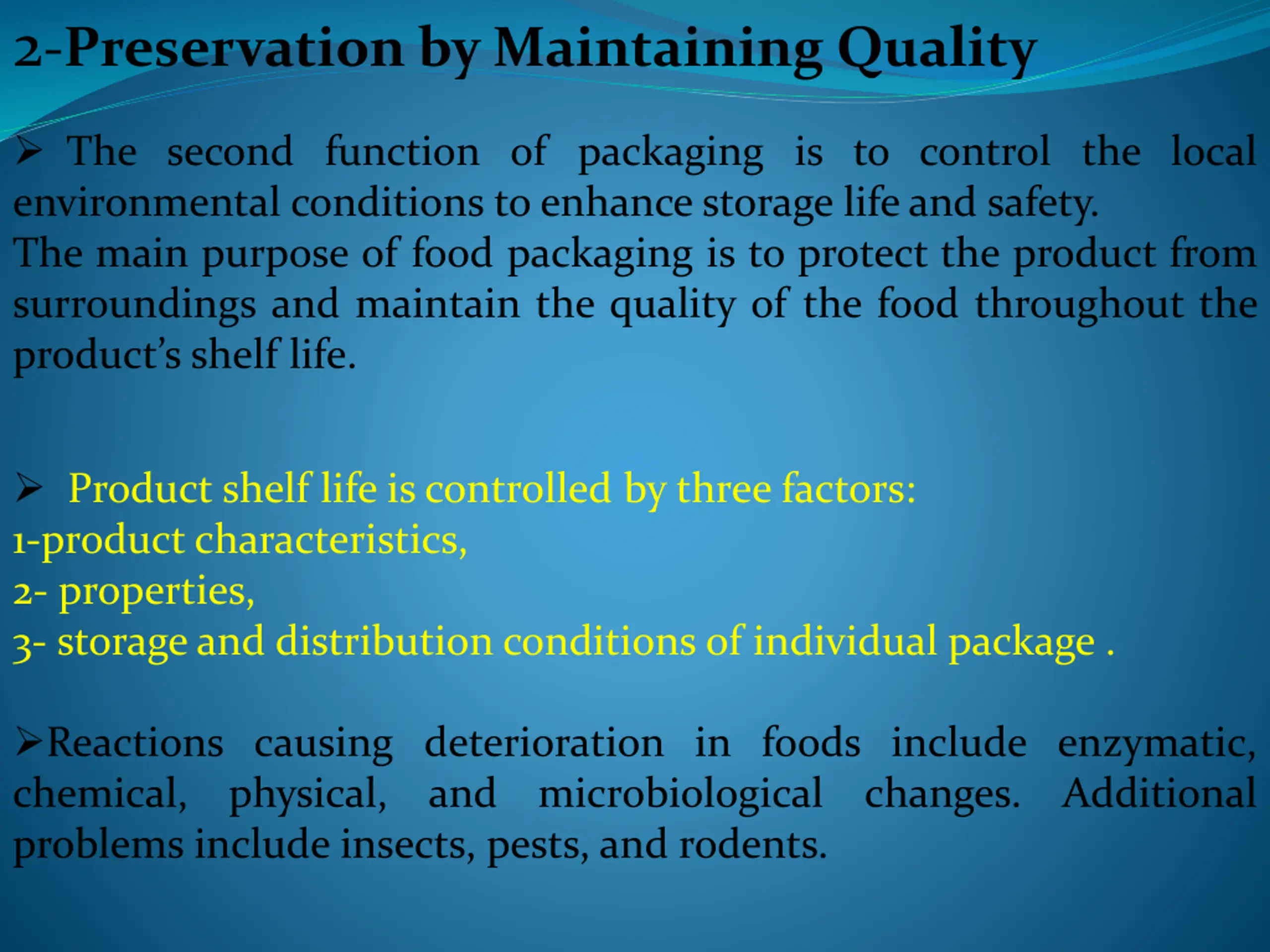 2-Preservation by Maintaining Quality The second function of packaging is to control the local environmental conditions to enhance storage life and safety. The main purpose of food packaging is to protect the product from surroundings and maintain the quality of the food throughout the product s shelf life. Product shelf life is controlled by three factors: 1-product characteristics, 2- properties, 3- storage and distribution conditions of individual package . Reactions causing deterioration in foods include enzymatic, chemical, physical, and microbiological changes. Additional problems include insects, pests, and rodents.