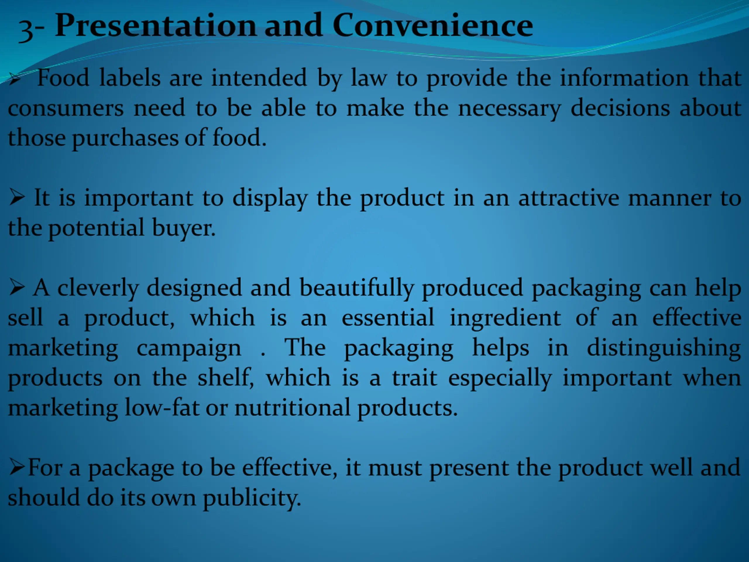 3- Presentation and Convenience Food labels are intended by law to provide the information that consumers need to be able to make the necessary decisions about those purchases of food. It is important to display the product in an attractive manner to the potential buyer. A cleverly designed and beautifully produced packaging can help sell a product, which is an essential ingredient of an effective marketing campaign . The packaging helps in distinguishing products on the shelf, which is a trait especially important when marketing low-fat or nutritional products. For a package to be effective, it must present the product well and should do its own publicity.