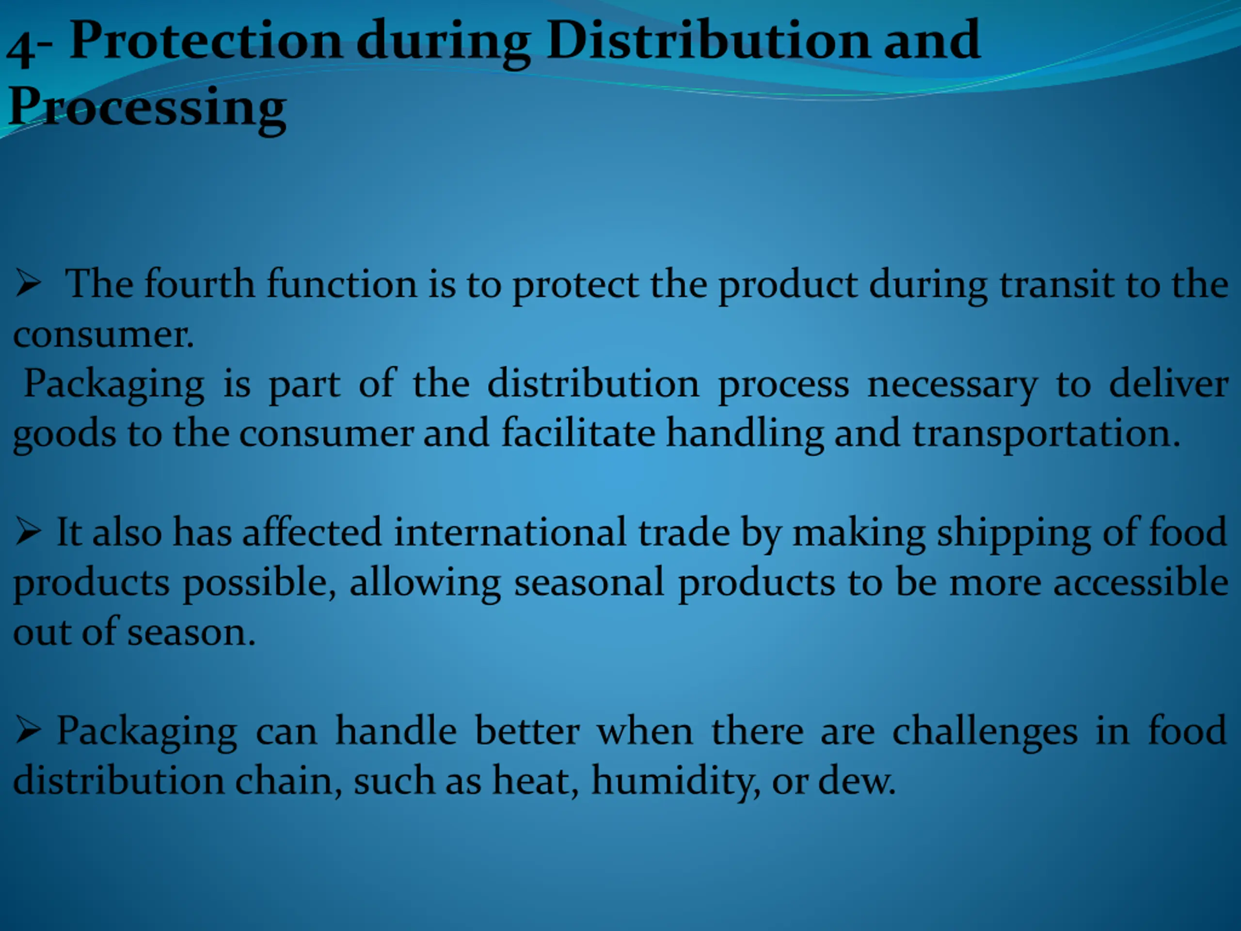4- Protection during Distribution and Processing The fourth function is to protect the product during transit to the consumer. Packaging is part of the distribution process necessary to deliver goods to the consumer and facilitate handling and transportation. It also has affected international trade by making shipping of food products possible, allowing seasonal products to be more accessible out of season. Packaging can handle better when there are challenges in food distribution chain, such as heat, humidity, or dew.