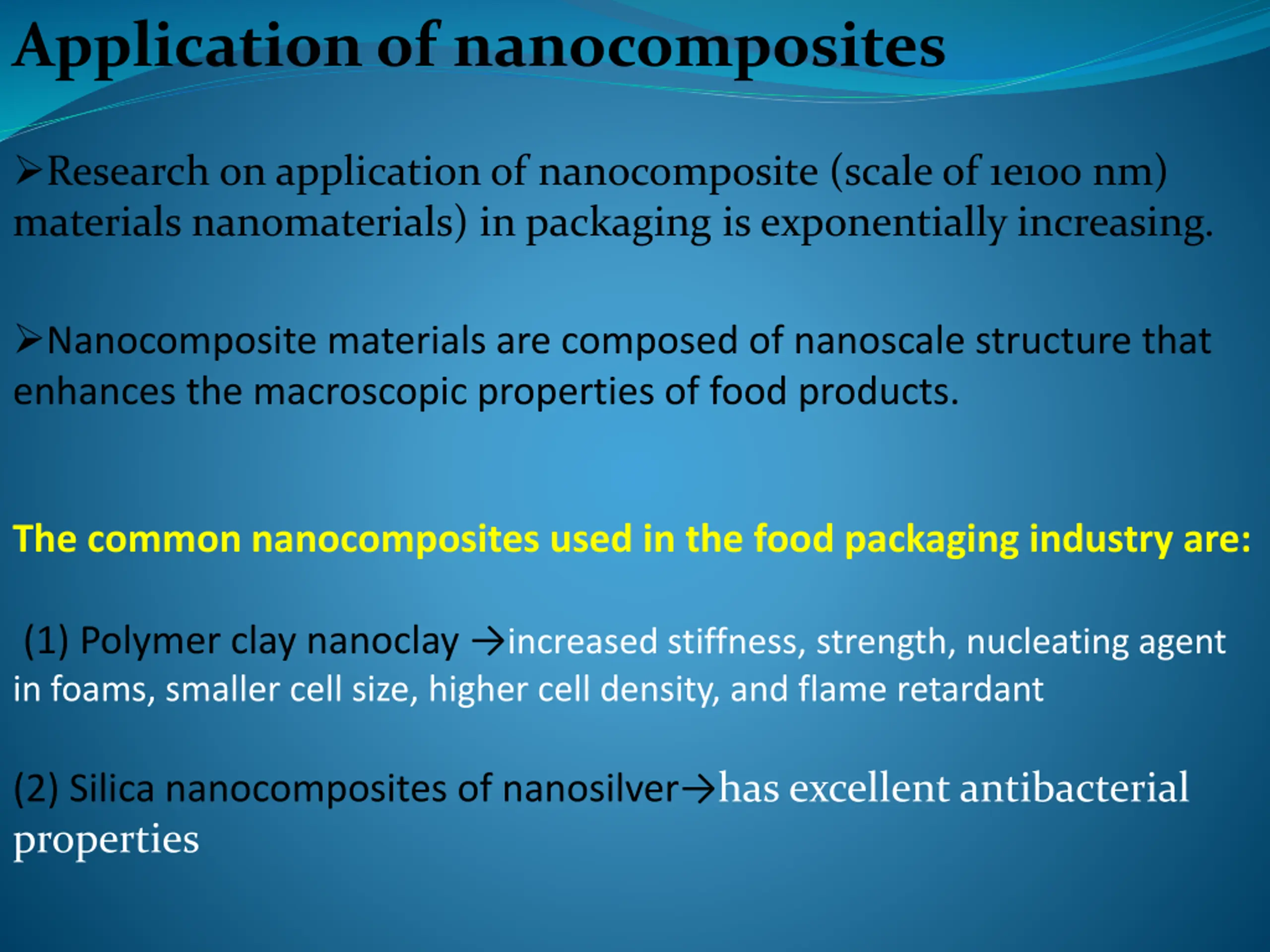 Application of nanocomposites Research on application of nanocomposite (scale of 1e100 nm) materials nanomaterials) in packaging is exponentially increasing. Nanocomposite materials are composed of nanoscale structure that enhances the macroscopic properties of food products. The common nanocomposites used in the food packaging industry are: (1) Polymer clay nanoclay increased stiffness, strength, nucleating agent in foams, smaller cell size, higher cell density, and flame retardant (2) Silica nanocomposites of nanosilver has excellent antibacterial properties