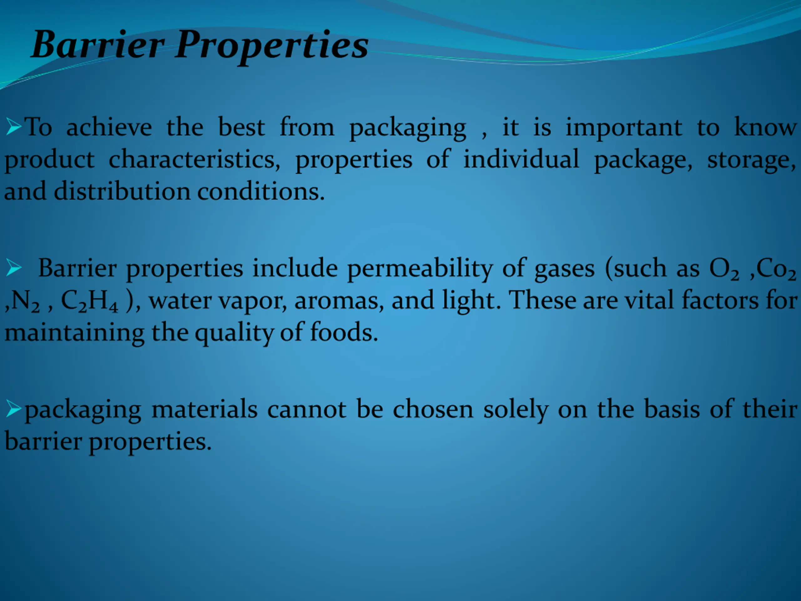 Barrier Properties To achieve the best from packaging , it is important to know product characteristics, properties of individual package, storage, and distribution conditions. Barrier properties include permeability of gases (such as O ,Co ,N , C H ), water vapor, aromas, and light. These are vital factors for maintaining the quality of foods. packaging materials cannot be chosen solely on the basis of their barrier properties.