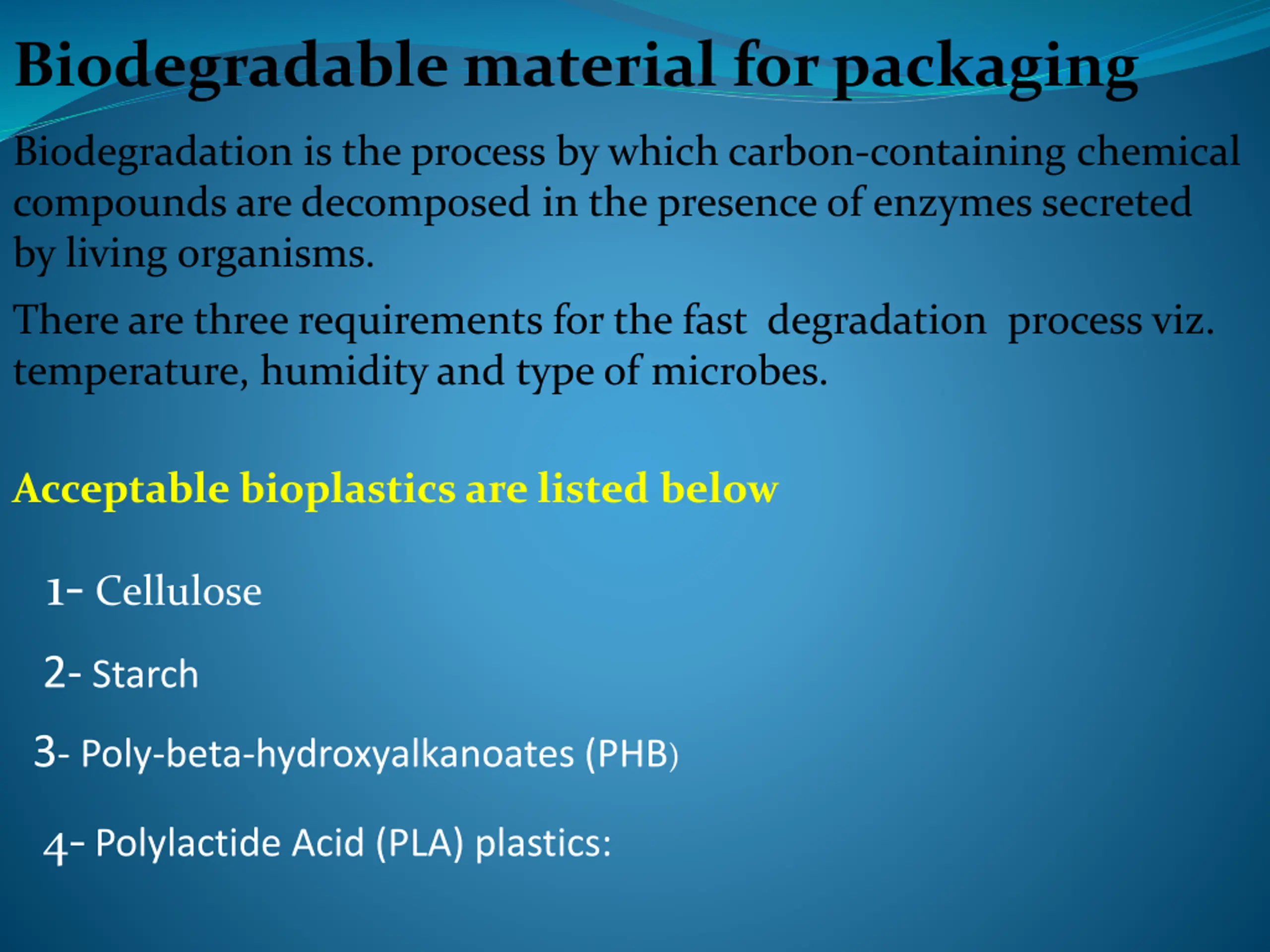 Biodegradable material for packaging Biodegradation is the process by which carbon-containing chemical compounds are decomposed in the presence of enzymes secreted by living organisms. There are three requirements for the fast degradation process viz. temperature, humidity and type of microbes. Acceptable bioplastics are listed below 1- Cellulose 2- Starch 3- Poly-beta-hydroxyalkanoates (PHB) 4-Polylactide Acid (PLA) plastics: