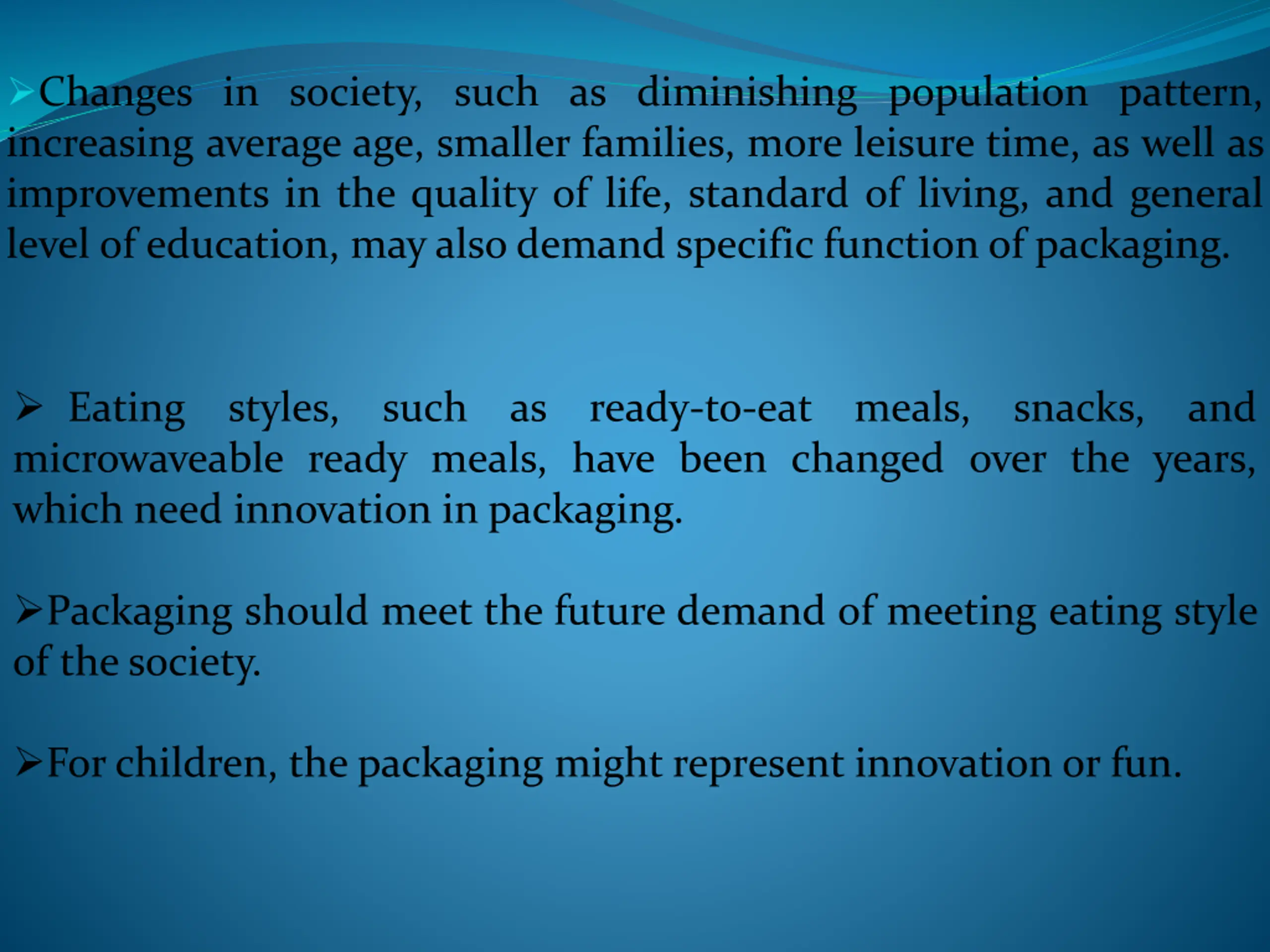 Changes in society, such as diminishing population pattern, increasing average age, smaller families, more leisure time, as well as improvements in the quality of life, standard of living, and general level of education, may also demand specific function of packaging. Eating styles, such as ready-to-eat meals, snacks, and microwaveable ready meals, have been changed over the years, which need innovation in packaging. Packaging should meet the future demand of meeting eating style of the society. For children, the packaging might represent innovation or fun.