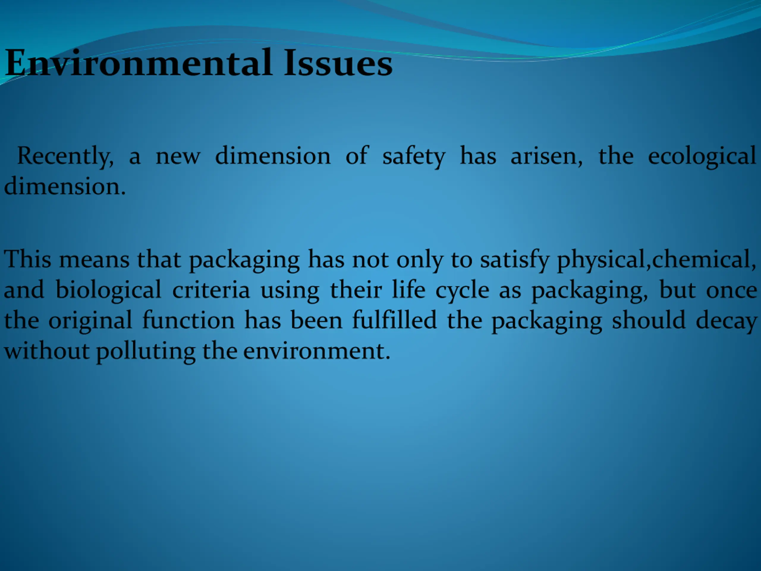 Environmental Issues Recently, a new dimension of safety has arisen, the ecological dimension. This means that packaging has not only to satisfy physical,chemical, and biological criteria using their life cycle as packaging, but once the original function has been fulfilled the packaging should decay without polluting the environment.