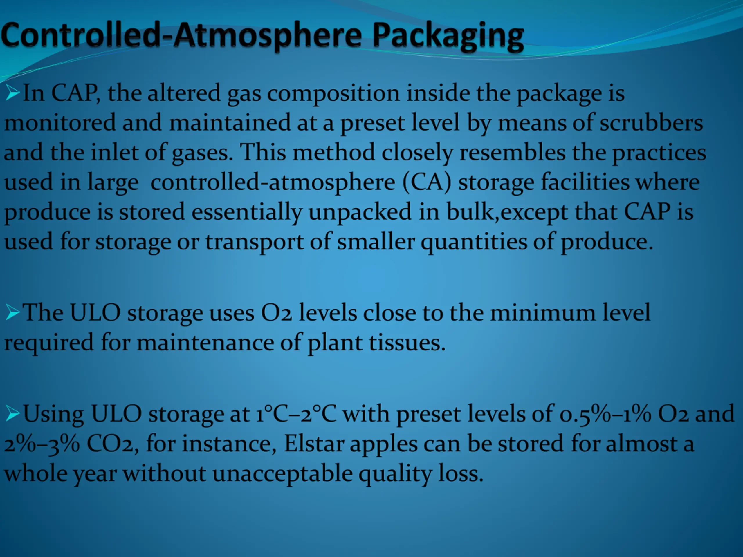 In CAP, the altered gas composition inside the package is monitored and maintained at a preset level by means of scrubbers and the inlet of gases. This method closely resembles the practices used in large controlled-atmosphere (CA) storage facilities where produce is stored essentially unpacked in bulk,except that CAP is used for storage or transport of smaller quantities of produce. The ULO storage uses O2 levels close to the minimum level required for maintenance of plant tissues. Using ULO storage at 1 C 2 C with preset levels of 0.5% 1% O2 and 2% 3% CO2, for instance, Elstar apples can be stored for almost a whole year without unacceptable quality loss.