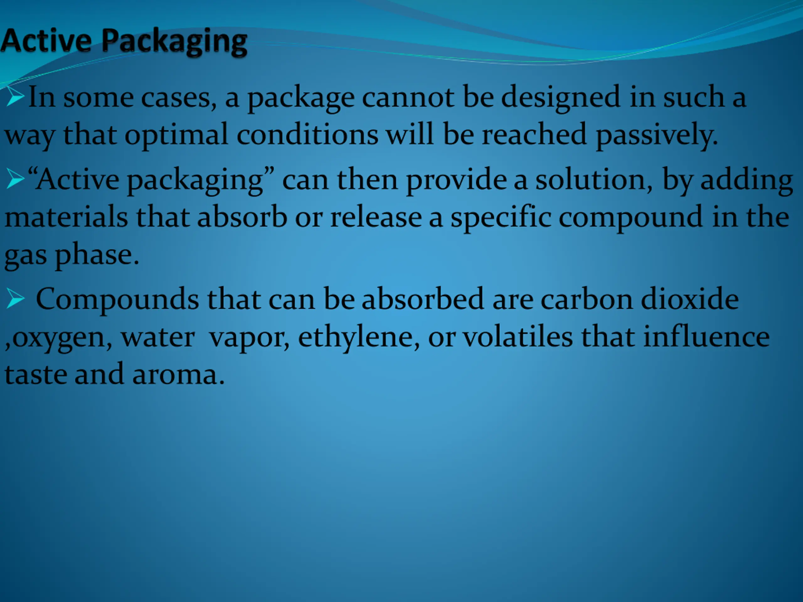 In some cases, a package cannot be designed in such a way that optimal conditions will be reached passively. Active packaging can then provide a solution, by adding materials that absorb or release a specific compound in the gas phase. Compounds that can be absorbed are carbon dioxide ,oxygen, water vapor, ethylene, or volatiles that influence taste and aroma.