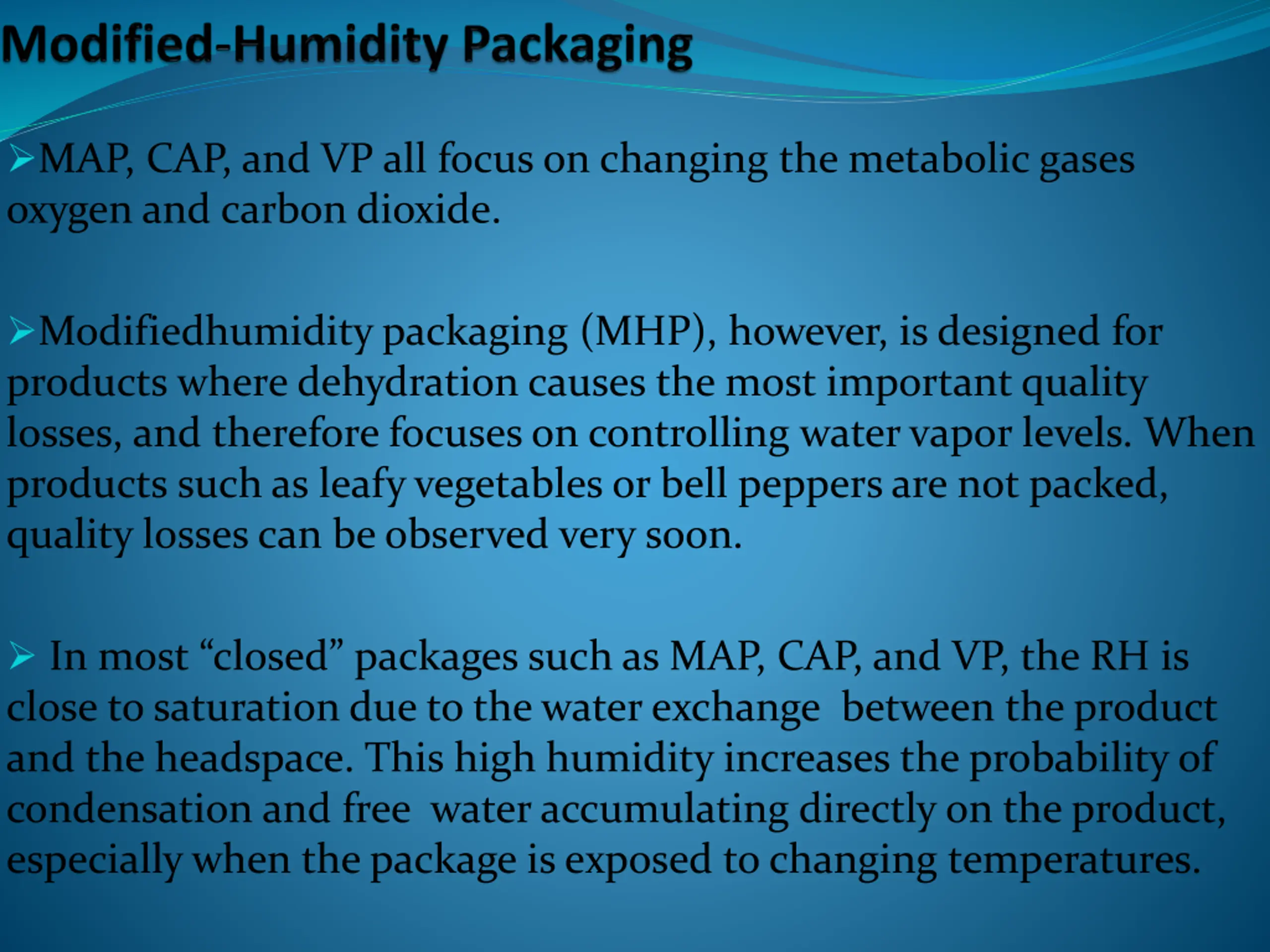 MAP, CAP, and VP all focus on changing the metabolic gases oxygen and carbon dioxide. Modifiedhumidity packaging (MHP), however, is designed for products where dehydration causes the most important quality losses, and therefore focuses on controlling water vapor levels. When products such as leafy vegetables or bell peppers are not packed, quality losses can be observed very soon. In most closed packages such as MAP, CAP, and VP, the RH is close to saturation due to the water exchange between the product and the headspace. This high humidity increases the probability of condensation and free water accumulating directly on the product, especially when the package is exposed to changing temperatures.