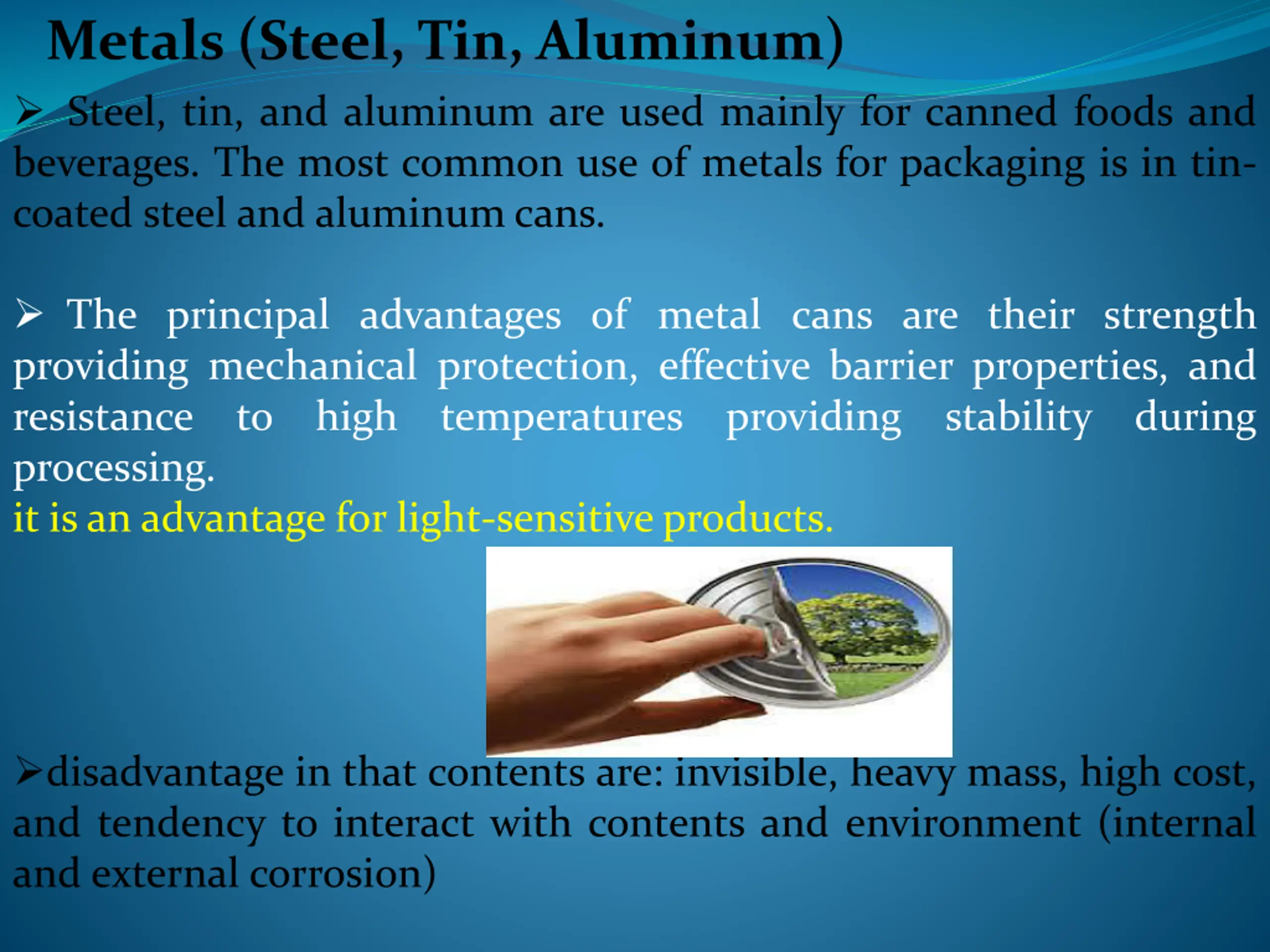 Metals (Steel, Tin, Aluminum) Steel, tin, and aluminum are used mainly for canned foods and beverages. The most common use of metals for packaging is in tin- coated steel and aluminum cans. The principal advantages of metal cans are their strength providing mechanical protection, effective barrier properties, and resistance to high temperatures providing stability during processing. it is an advantage for light-sensitive products. disadvantage in that contents are: invisible, heavy mass, high cost, and tendency to interact with contents and environment (internal and external corrosion)