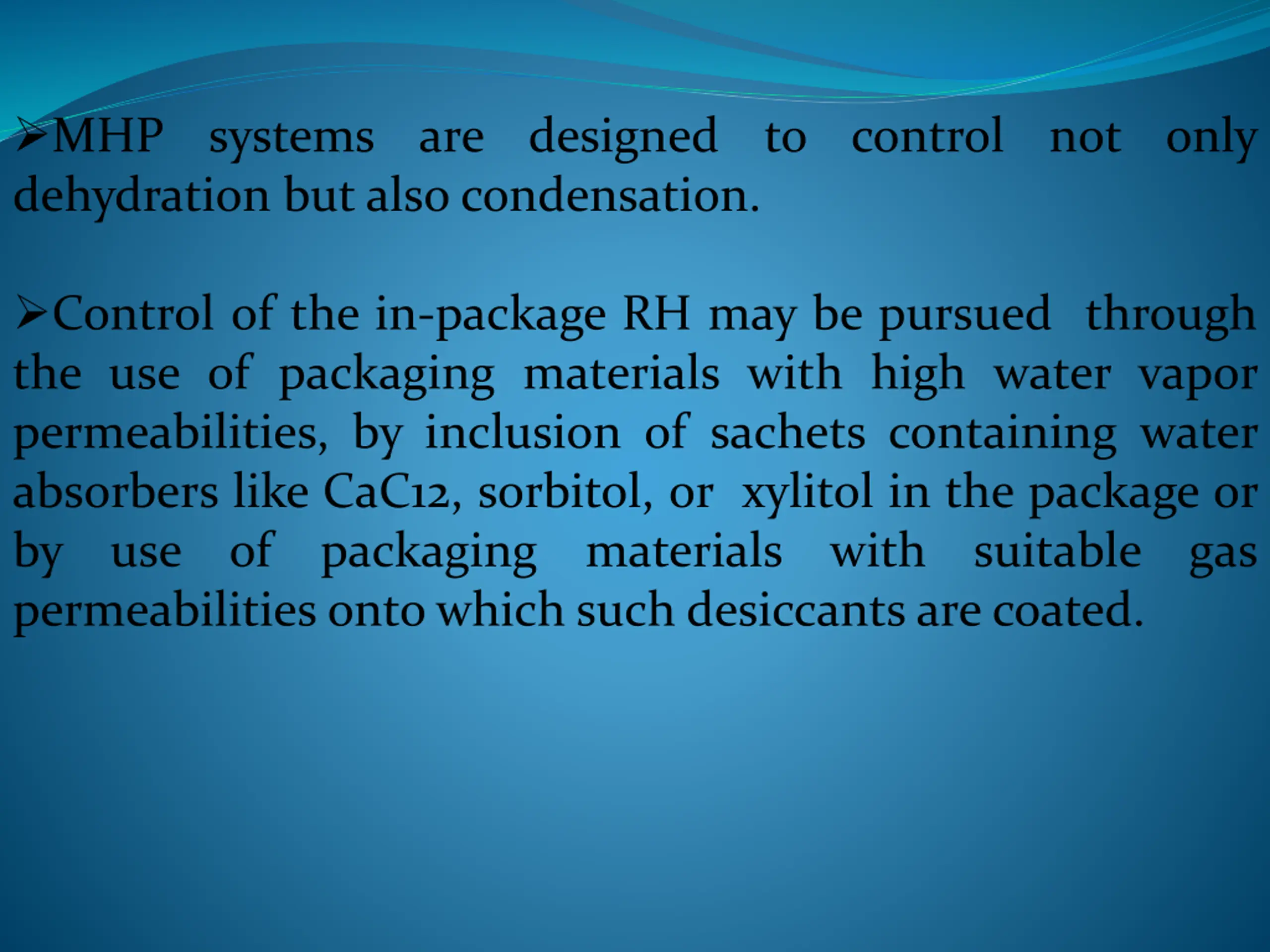 MHP systems are designed to control not only dehydration but also condensation. Control of the in-package RH may be pursued through the use of packaging materials with high water vapor permeabilities, by inclusion of sachets containing water absorbers like CaC12, sorbitol, or xylitol in the package or by use of packaging materials with suitable gas permeabilities onto which such desiccants are coated.