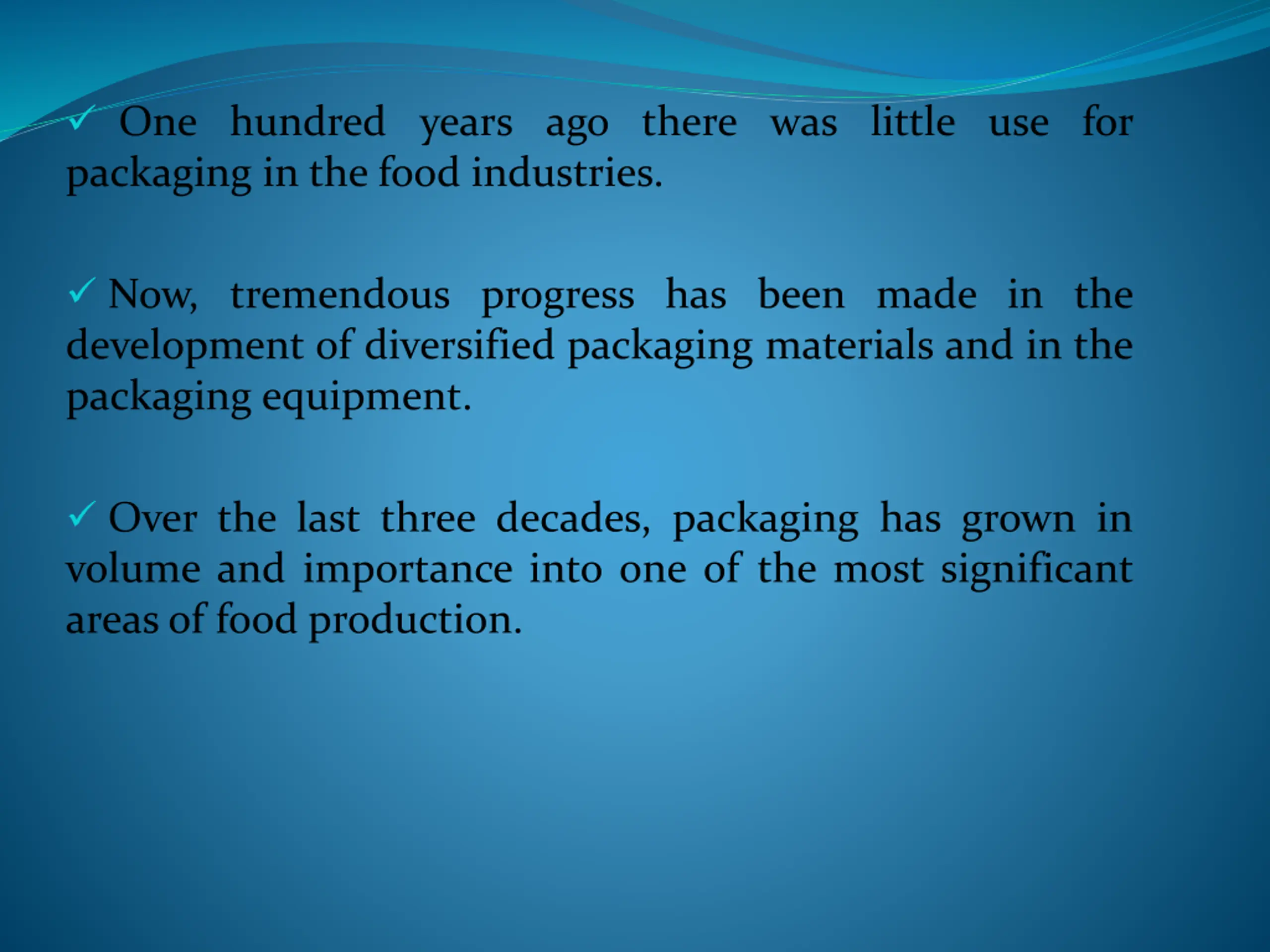 One hundred years ago there was little use for packaging in the food industries. Now, tremendous progress has been made in the development of diversified packaging materials and in the packaging equipment. Over the last three decades, packaging has grown in volume and importance into one of the most significant areas of food production.