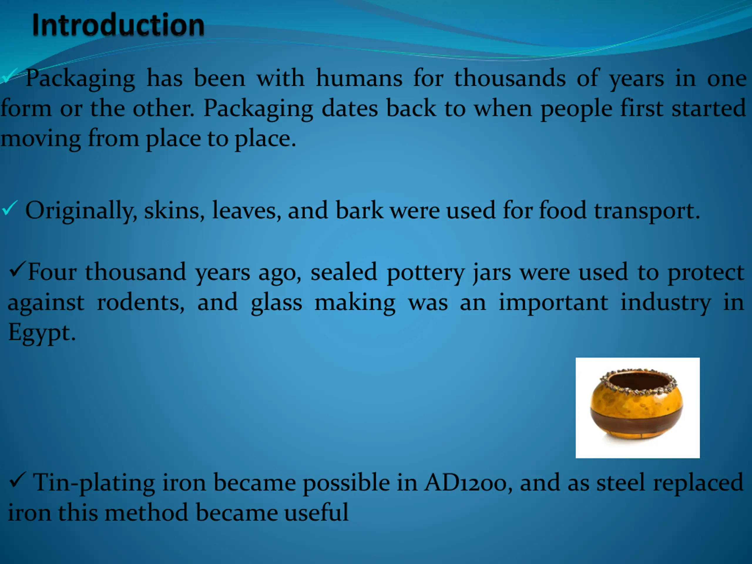 Packaging has been with humans for thousands of years in one form or the other. Packaging dates back to when people first started moving from place to place. Originally, skins, leaves, and bark were used for food transport. Four thousand years ago, sealed pottery jars were used to protect against rodents, and glass making was an important industry in Egypt. Tin-plating iron became possible in AD1200, and as steel replaced iron this method became useful