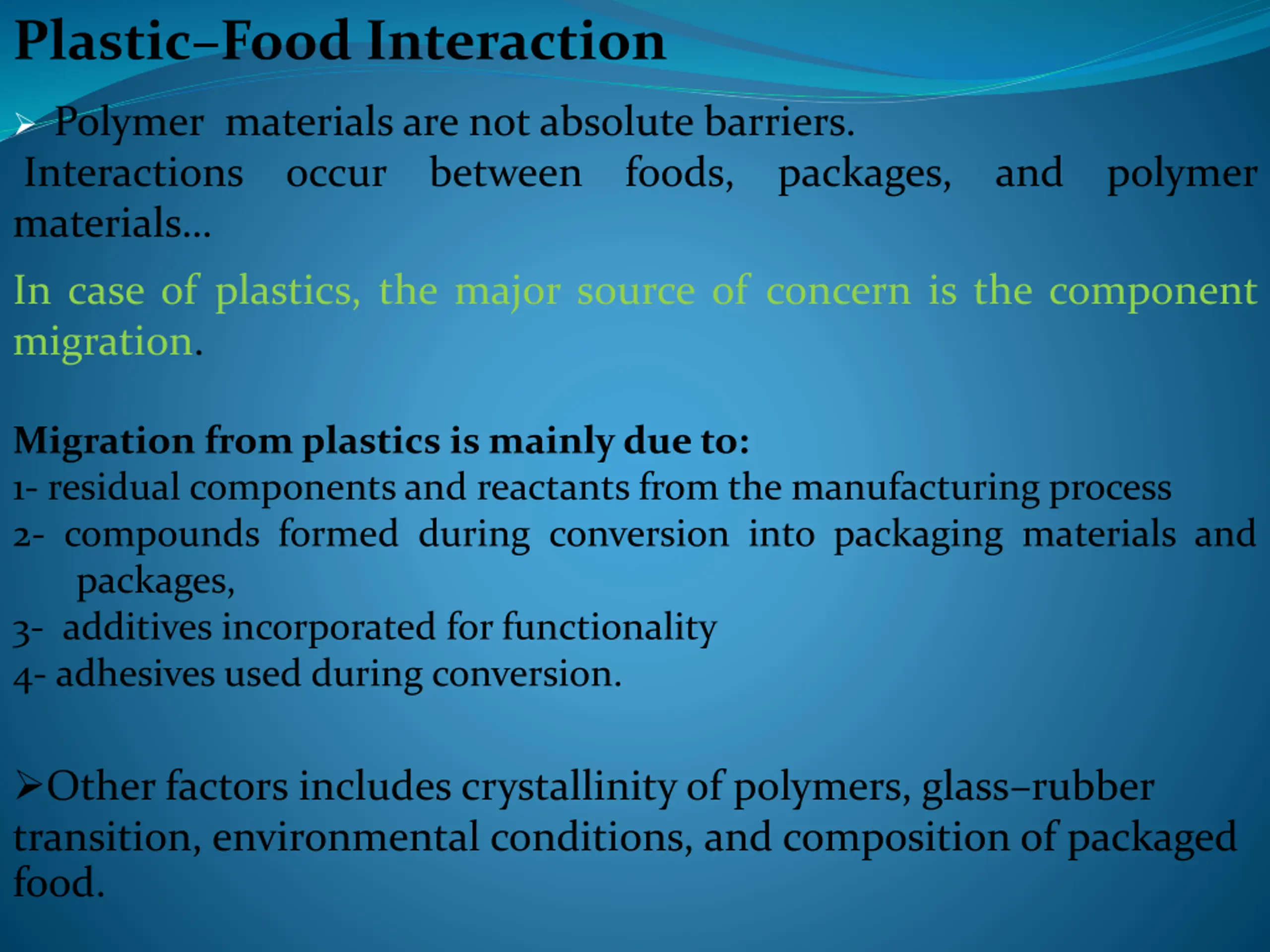 PlasticFood Interaction Polymer materials are not absolute barriers. Interactions occur between foods, packages, and polymer materials In case of plastics, the major source of concern is the component migration. Migration from plastics is mainly due to: 1- residual components and reactants from the manufacturing process 2- compounds formed during conversion into packaging materials and packages, 3- additives incorporated for functionality 4- adhesives used during conversion. Other factors includes crystallinity of polymers, glass rubber transition, environmental conditions, and composition of packaged food.