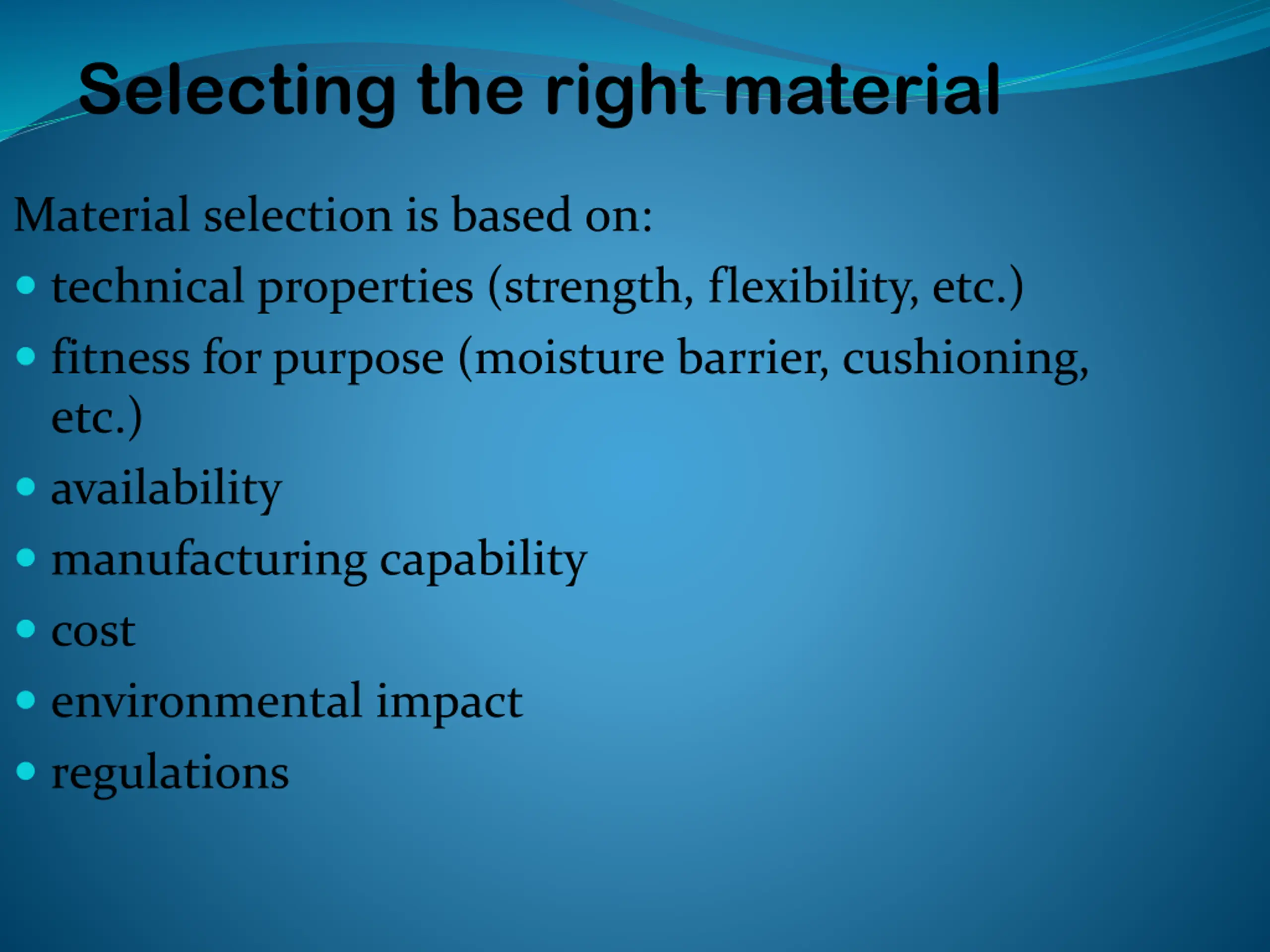 Selecting the right material Material selection is based on: technical properties (strength, flexibility, etc.) fitness for purpose (moisture barrier, cushioning, etc.) availability manufacturing capability cost environmental impact regulations