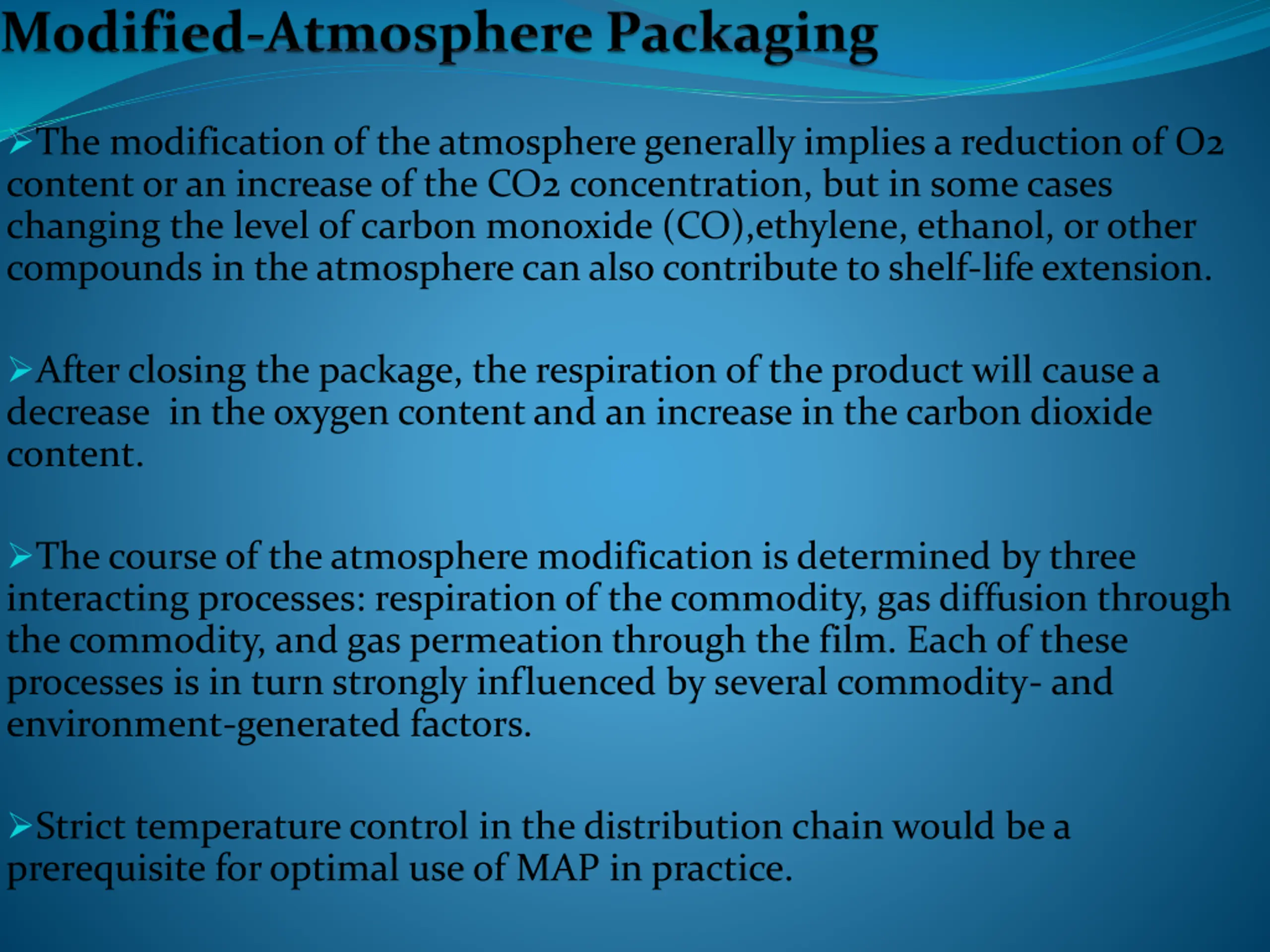 The modification of the atmosphere generally implies a reduction of O2 content or an increase of the CO2 concentration, but in some cases changing the level of carbon monoxide (CO),ethylene, ethanol, or other compounds in the atmosphere can also contribute to shelf-life extension. After closing the package, the respiration of the product will cause a decrease in the oxygen content and an increase in the carbon dioxide content. The course of the atmosphere modification is determined by three interacting processes: respiration of the commodity, gas diffusion through the commodity, and gas permeation through the film. Each of these processes is in turn strongly influenced by several commodity- and environment-generated factors. Strict temperature control in the distribution chain would be a prerequisite for optimal use of MAP in practice.