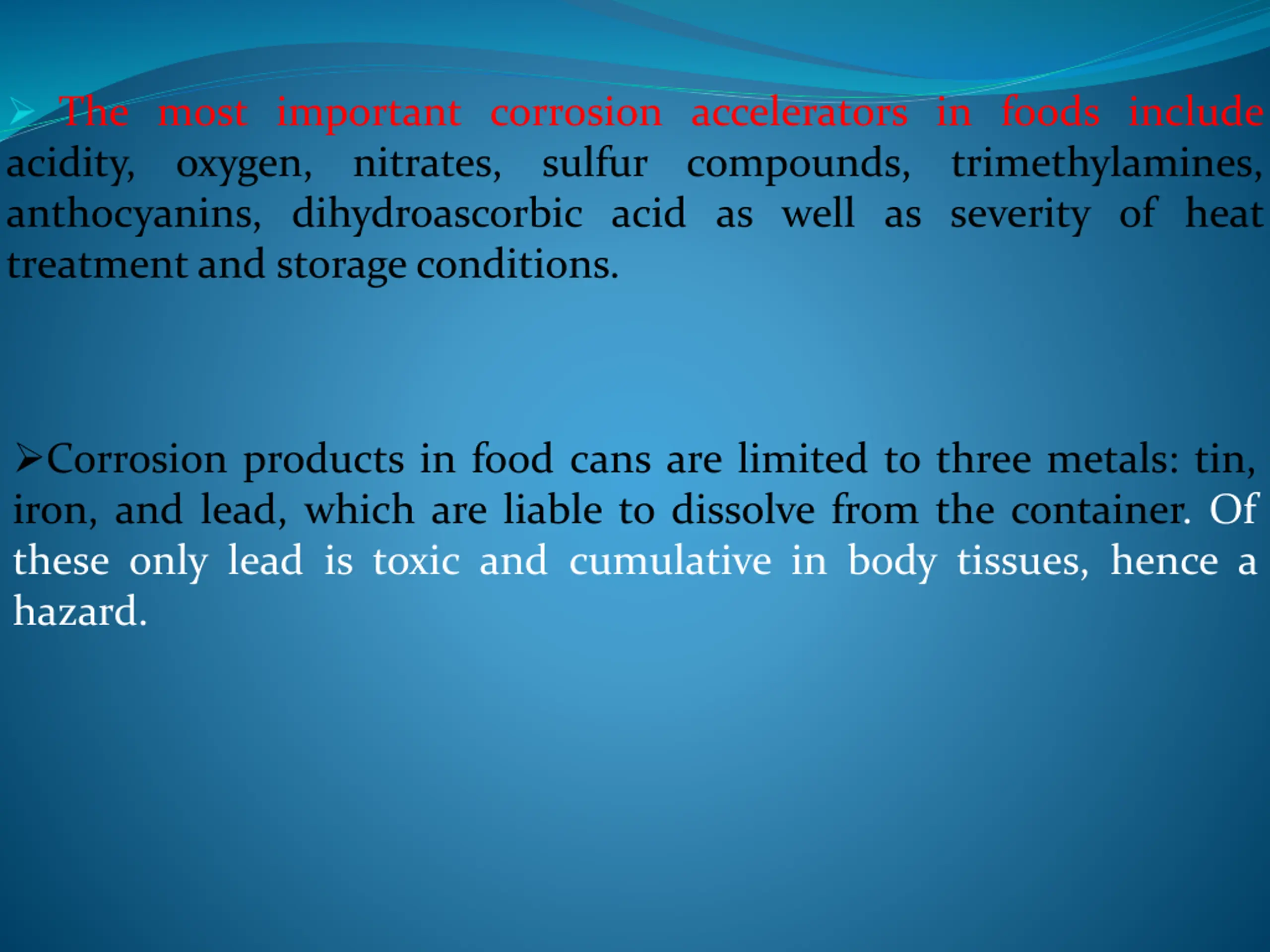 The most important corrosion accelerators in foods include acidity, oxygen, nitrates, sulfur compounds, trimethylamines, anthocyanins, dihydroascorbic acid as well as severity of heat treatment and storage conditions. Corrosion products in food cans are limited to three metals: tin, iron, and lead, which are liable to dissolve from the container. Of these only lead is toxic and cumulative in body tissues, hence a hazard.
