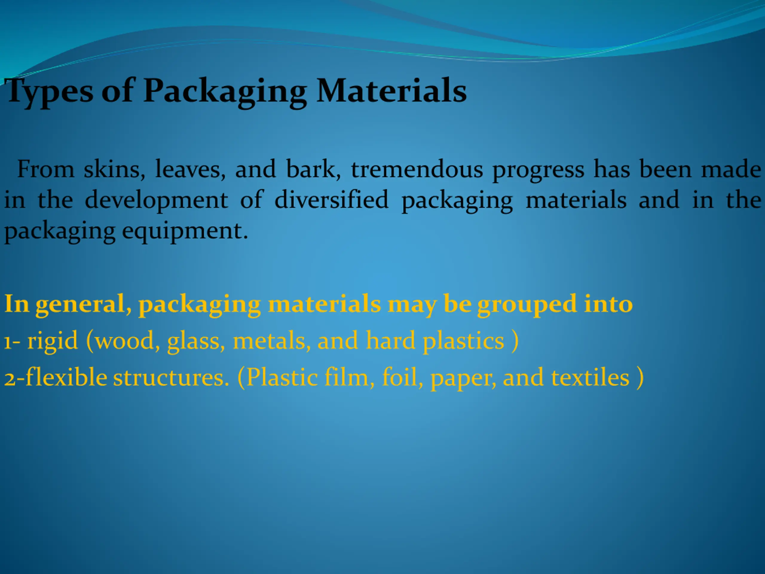 Types of Packaging Materials From skins, leaves, and bark, tremendous progress has been made in the development of diversified packaging materials and in the packaging equipment. In general, packaging materials may be grouped into 1- rigid (wood, glass, metals, and hard plastics ) 2-flexible structures. (Plastic film, foil, paper, and textiles )