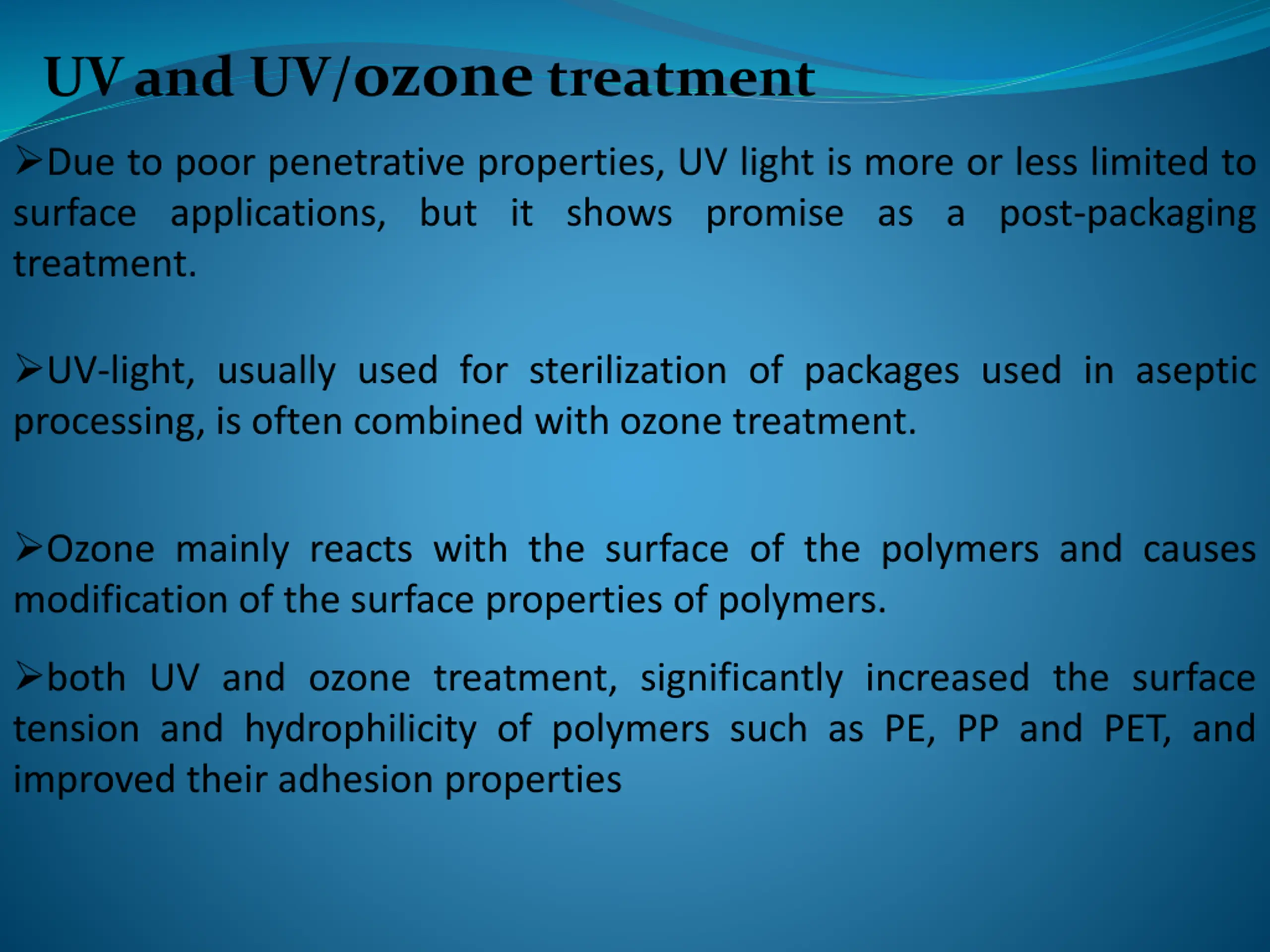 UV and UV/ozone treatment Due to poor penetrative properties, UV light is more or less limited to surface applications, but it shows promise as a post-packaging treatment. UV-light, usually used for sterilization of packages used in aseptic processing, is often combined with ozone treatment. Ozone mainly reacts with the surface of the polymers and causes modification of the surface properties of polymers. both UV and ozone treatment, significantly increased the surface tension and hydrophilicity of polymers such as PE, PP and PET, and improved their adhesion properties