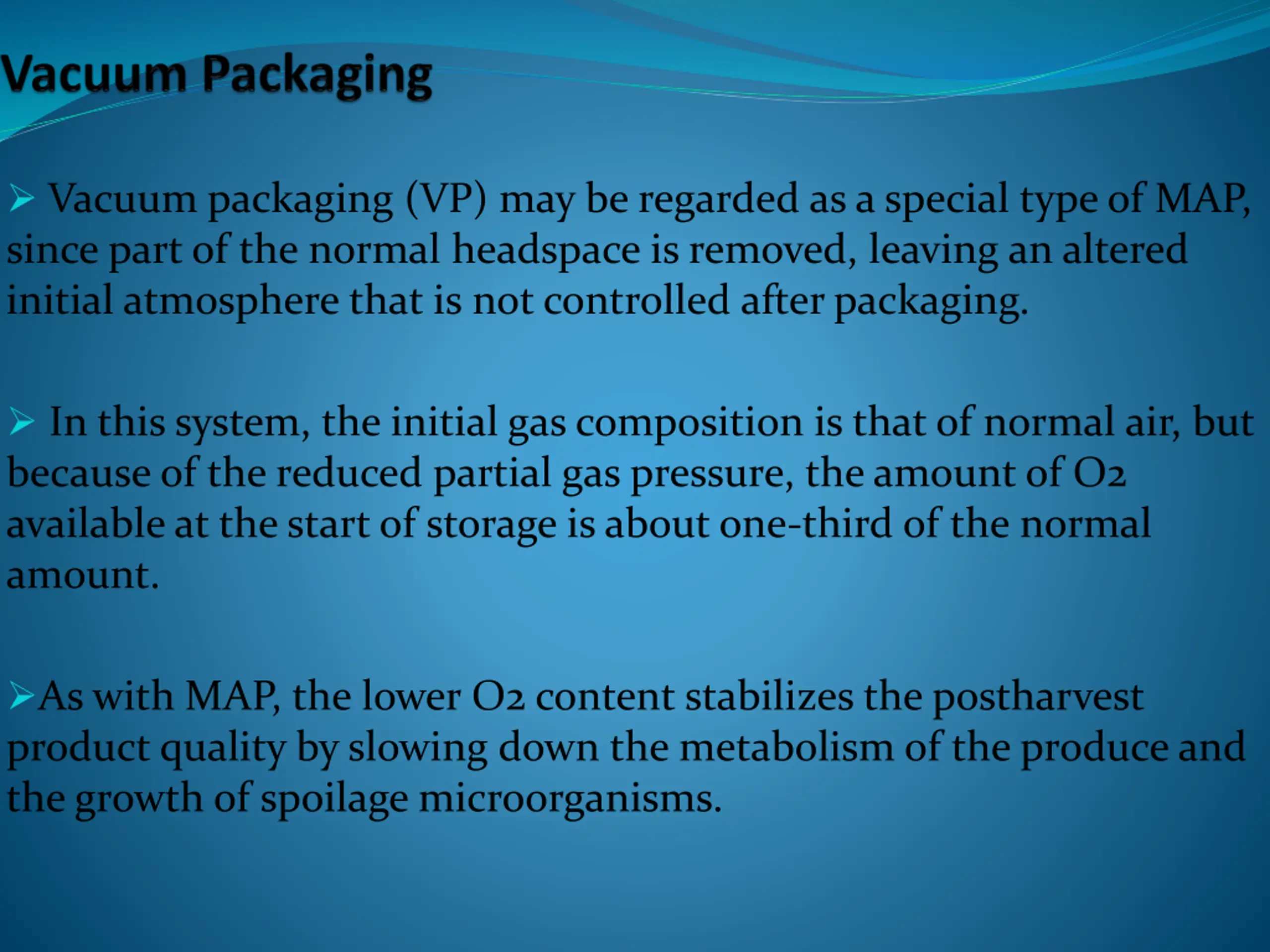 Vacuum packaging (VP) may be regarded as a special type of MAP, since part of the normal headspace is removed, leaving an altered initial atmosphere that is not controlled after packaging. In this system, the initial gas composition is that of normal air, but because of the reduced partial gas pressure, the amount of O2 available at the start of storage is about one-third of the normal amount. As with MAP, the lower O2 content stabilizes the postharvest product quality by slowing down the metabolism of the produce and the growth of spoilage microorganisms.
