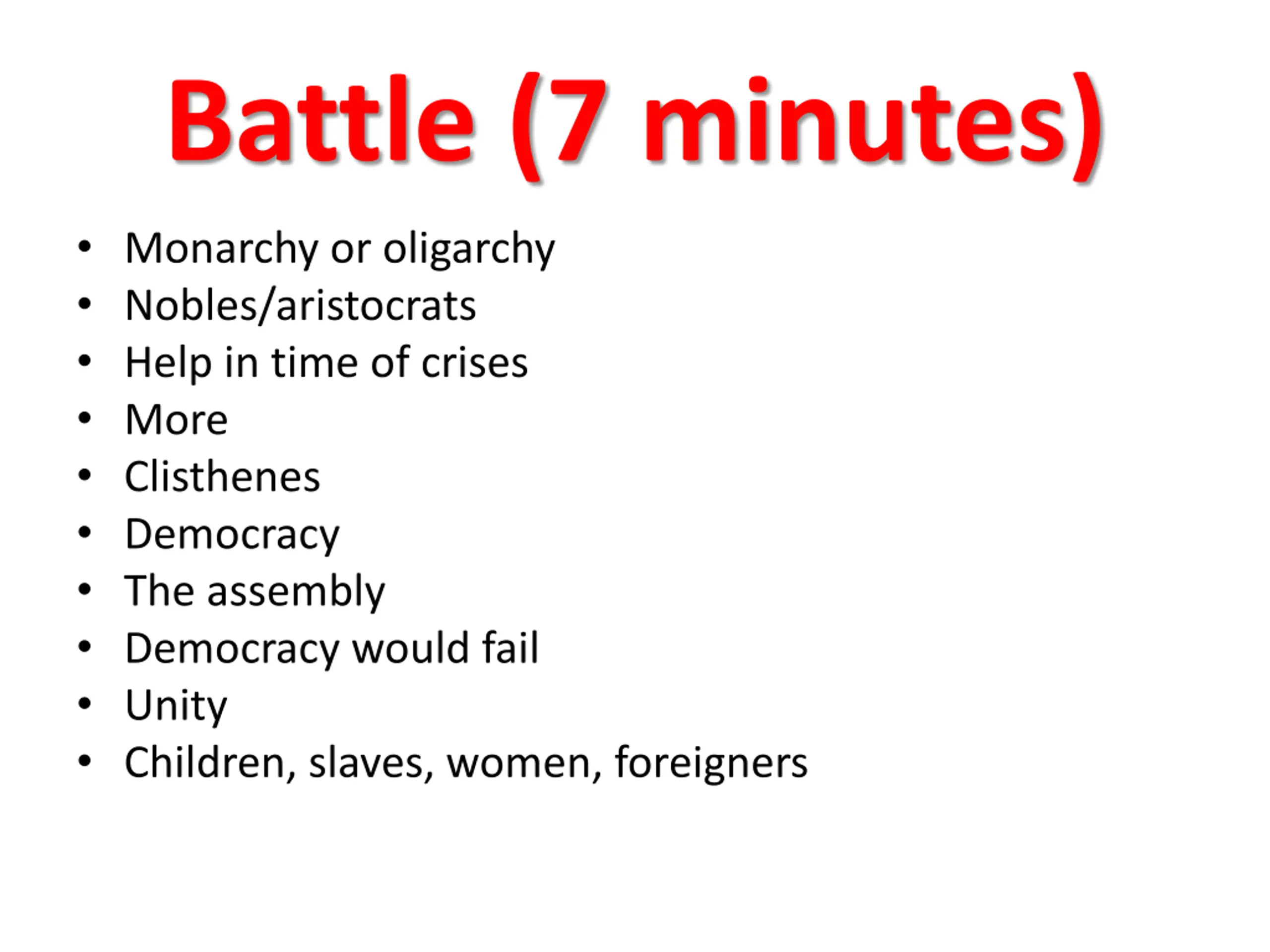 Battle (7 minutes) Monarchy or oligarchy Nobles/aristocrats Help in time of crises More Clisthenes Democracy The assembly Democracy would fail Unity Children, slaves, women, foreigners