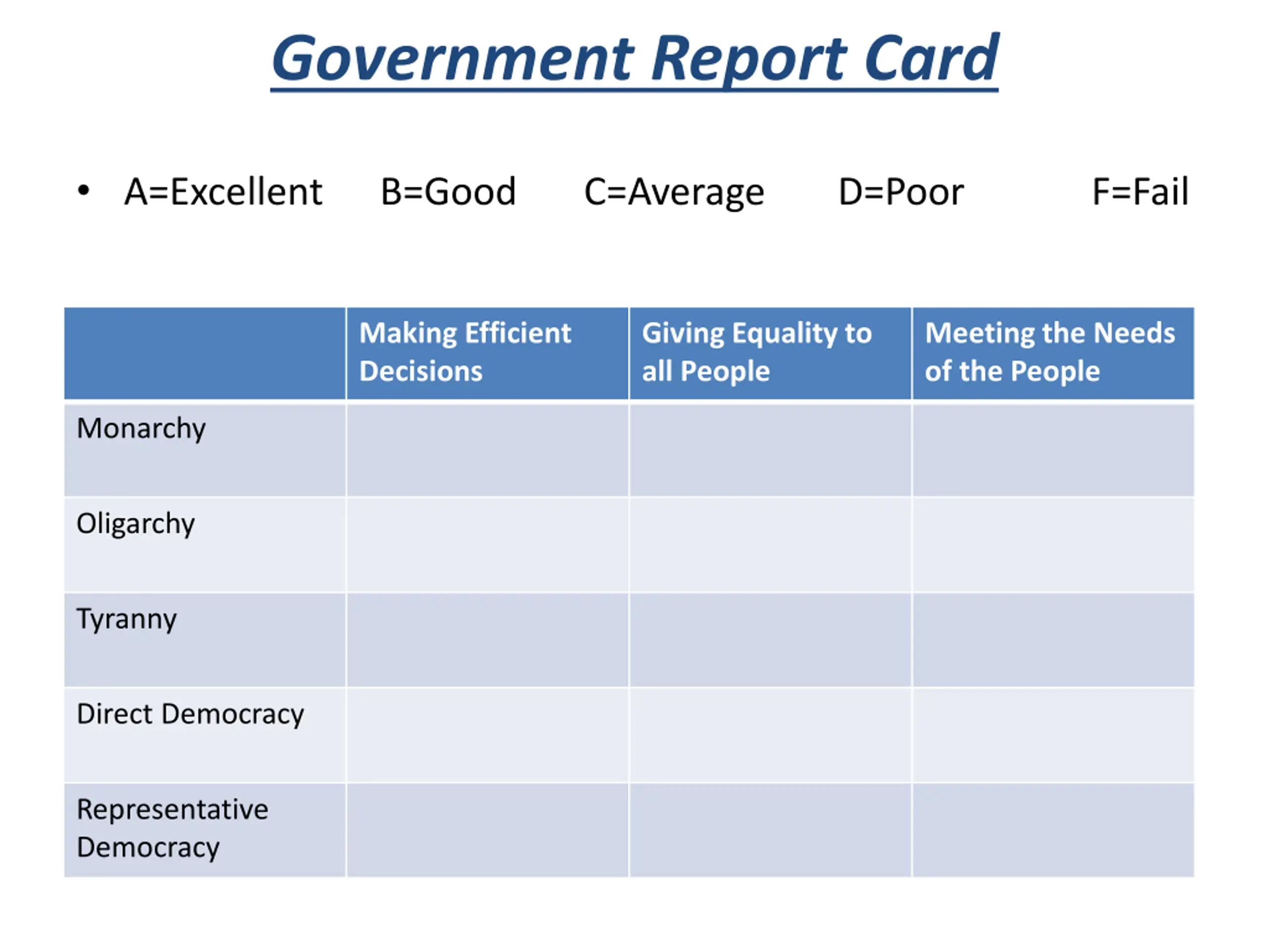 Government Report Card A=Excellent B=Good C=Average D=Poor F=Fail Making Efficient Decisions Giving Equality to all People Meeting the Needs of the People Monarchy Oligarchy Tyranny Direct Democracy Representative Democracy