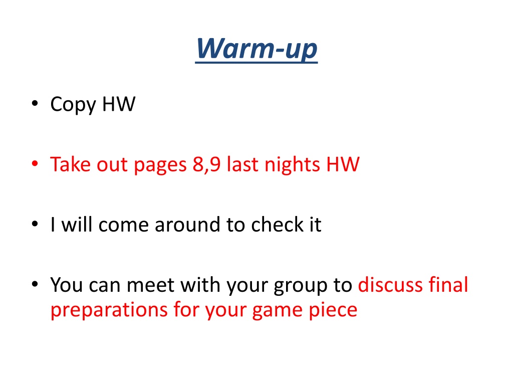 Warm-up Copy HW Take out pages 8,9 last nights HW I will come around to check it You can meet with your group to discuss final preparations for your game piece