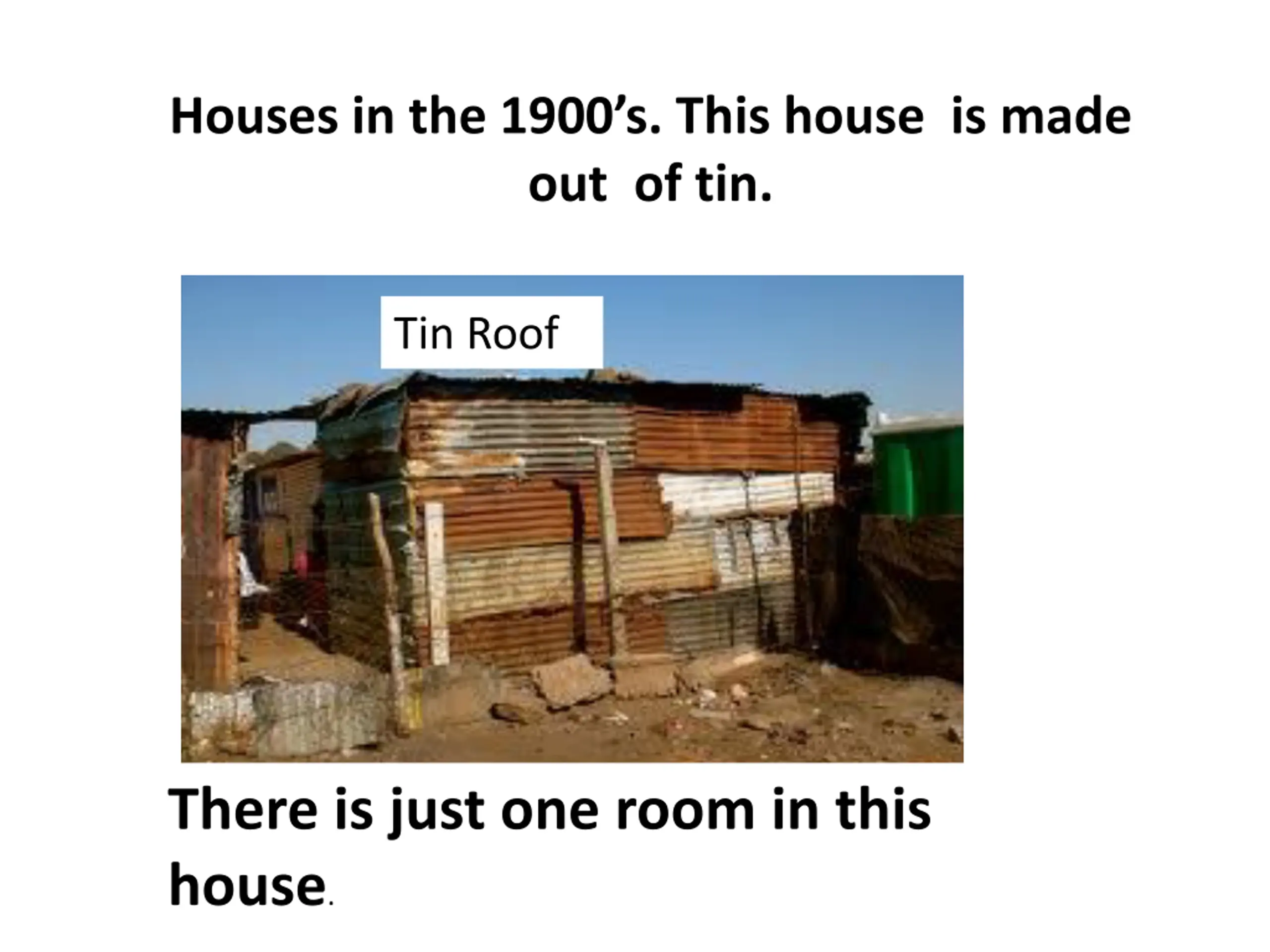 Houses in the 1900s. This house is made out of tin. Tin Roof There is just one room in this house.
