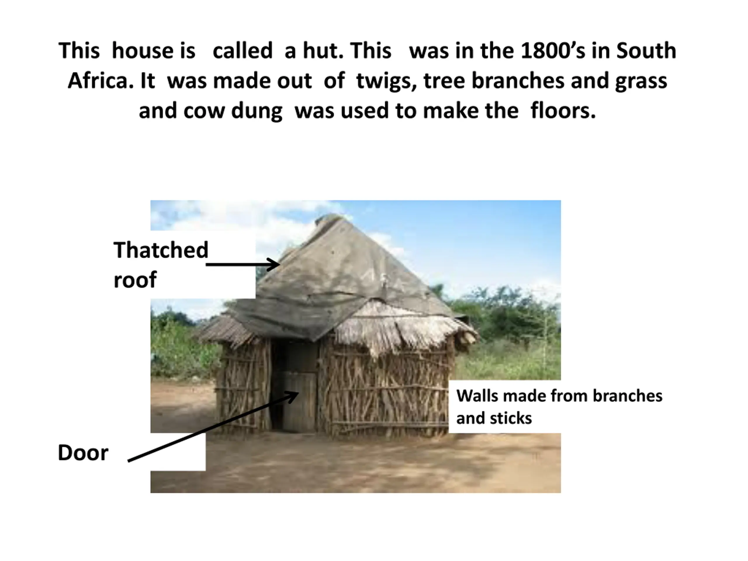 This house is called a hut. This was in the 1800s in South Africa. It was made out of twigs, tree branches and grass and cow dung was used to make the floors. Thatched roof Walls made from branches and sticks Door