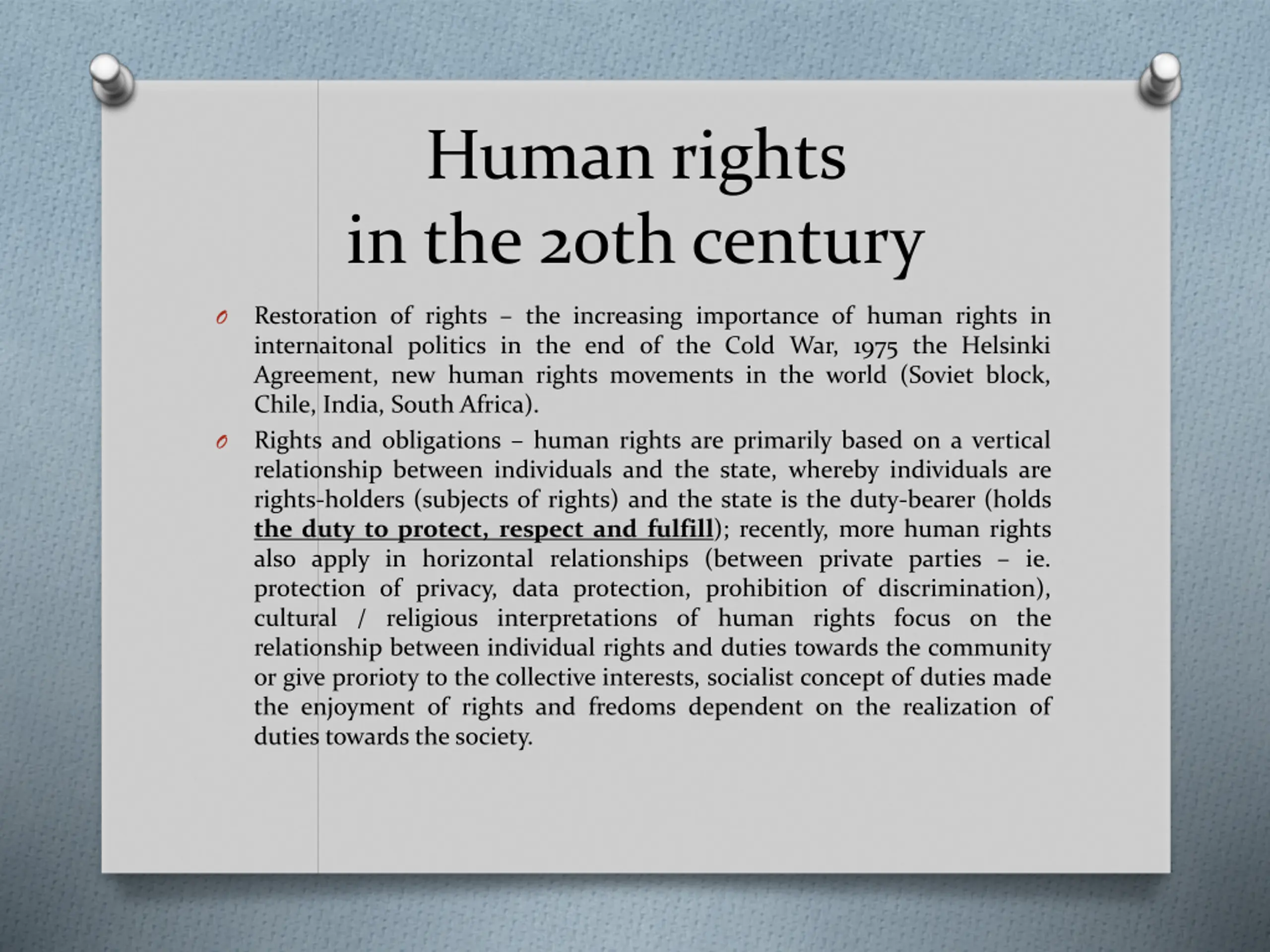 Human rights in the 20th century O Restoration of rights the increasing importance of human rights in internaitonal politics in the end of the Cold War, 1975 the Helsinki Agreement, new human rights movements in the world (Soviet block, Chile, India, South Africa). Rights and obligations human rights are primarily based on a vertical relationship between individuals and the state, whereby individuals are rights-holders (subjects of rights) and the state is the duty-bearer (holds the duty to protect, respect and fulfill); recently, more human rights also apply in horizontal relationships (between private parties ie. protection of privacy, data protection, prohibition of discrimination), cultural / religious interpretations of human rights focus on the relationship between individual rights and duties towards the community or give prorioty to the collective interests, socialist concept of duties made the enjoyment of rights and fredoms dependent on the realization of duties towards the society. O