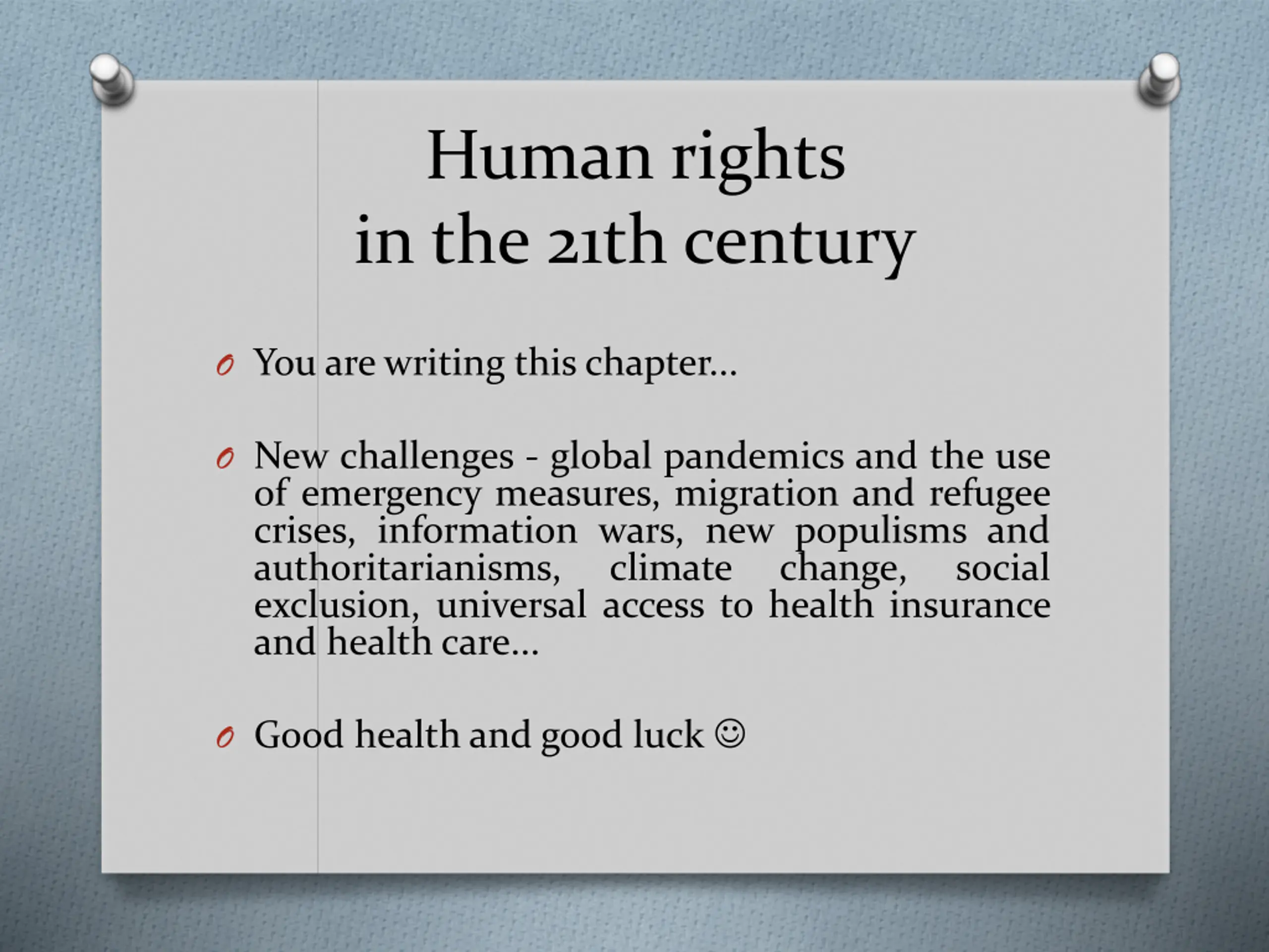 Human rights in the 21th century O You arewriting this chapter... O New challenges - global pandemics and the use of emergency measures, migration and refugee crises, information wars, new populisms and authoritarianisms, climate exclusion, universal access to health insurance and health care... change, social O Good health and good luck