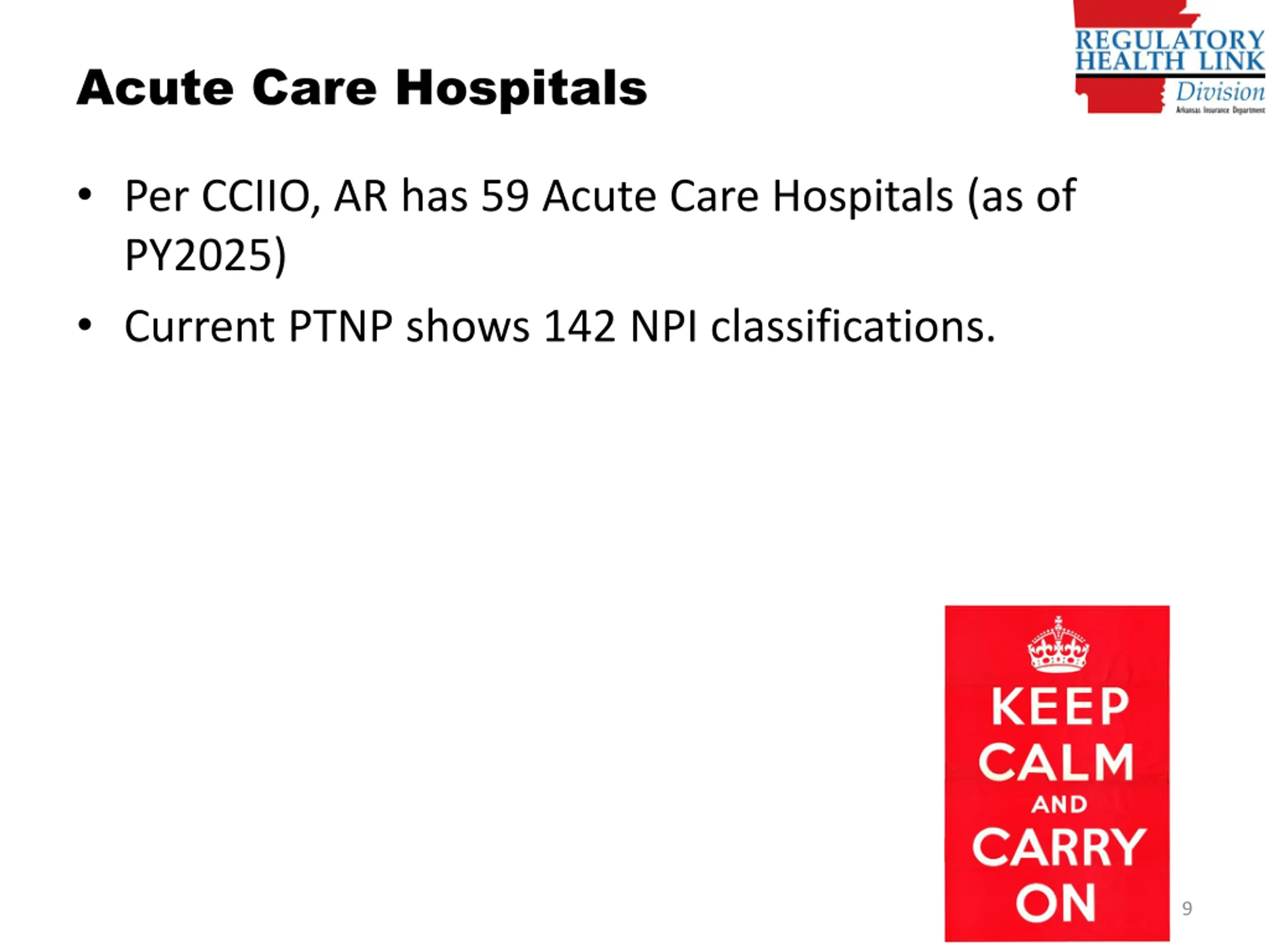 Acute Care Hospitals Per CCIIO, AR has 59 Acute Care Hospitals (as of PY2025) Current PTNP shows 142 NPI classifications. Alarmingly high but The high number includes out-of-state providers Multiple NPIs per hospital Actual count is nearer to 79 hospitals inside Arkansas Needs attention. 9